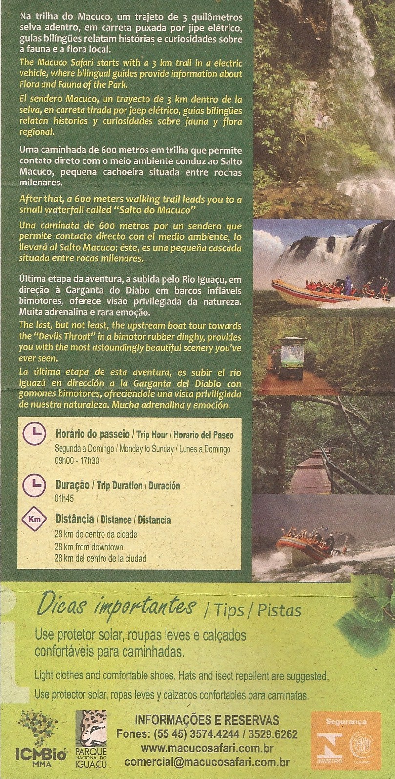 Outros passeios que vocês podem fazer tanto pelo lado brasileiro quanto pelo argentino podem ser observados no site do Macuco Safari (aqui somente o lado brasileiro)