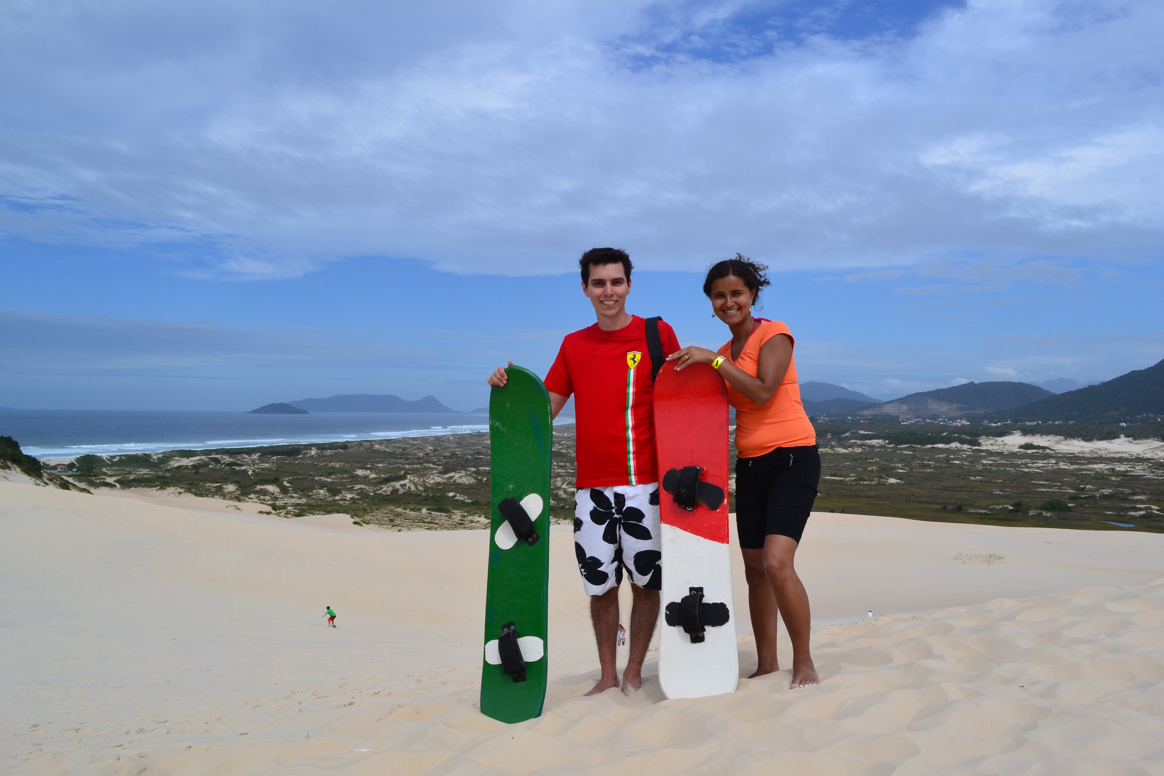 Fizemos este passeio durante a manhã antes de irmos para a Praia de Joaquina. Existem várias dunas para visitar e andar, mas a melhor e maior é a da Praia de Joaquina. Fica a poucos metros da Praia de Joaquina. O valor para alugar as pranchas é de R$ 20,00 a hora por pessoa. Você pode utilizar pranchas para descer em pé ou sentado, fica a sua escolha e pode efetuar a troca quantas vezes quiser.