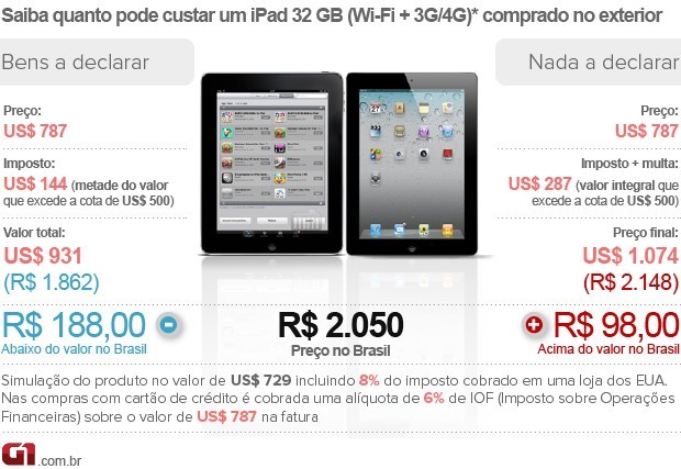 O imposto é 50% do valor excedente. Por exemplo: num total de US$ 600, o imposto será sobre os US$ 100 excedentes, ou seja, US$ 50. Se o produto não for declarado, o passageiro terá que pagar o imposto de 50% e uma multa de 50% sobre o excedente.