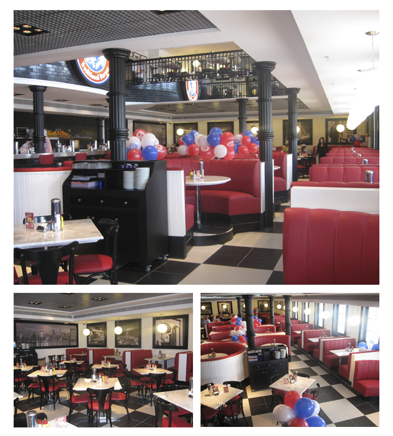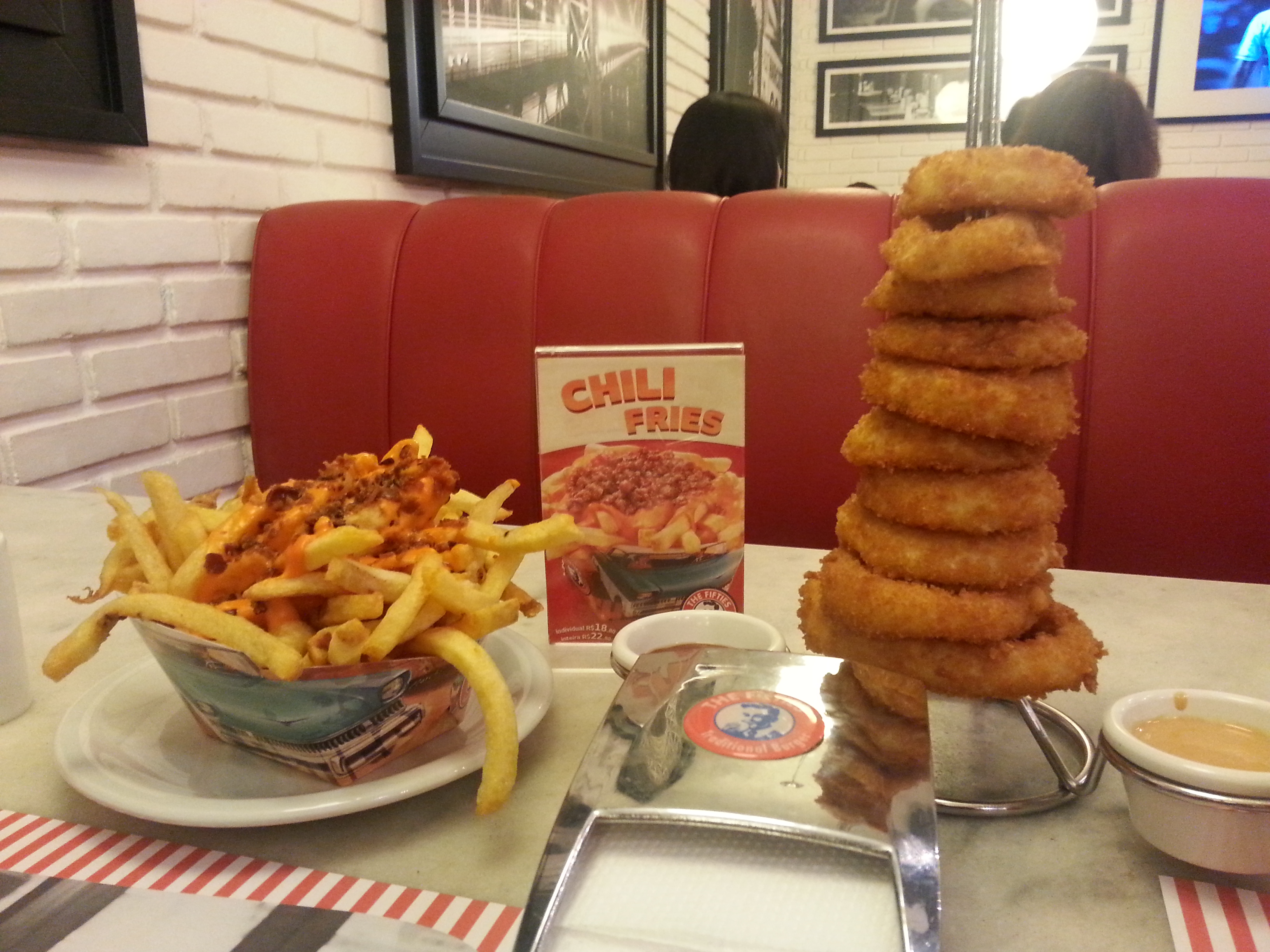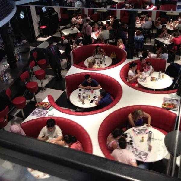 Nunca havia se quer reparado neste restaurante. Por fora não dei nada pra ele, mas logo na porta achei o máximo. Local amplo, com 2 andares, com as acomodações em sofás grandes, redondos e vermelhos, cadeiras no balcão e mesas convencionais. Depois pesquisando no site do restaurante notei que todos os outros restaurantes da rede seguem a mesma decoração sendo tudo muito bem iluminado, moderno com toques de Rock`n Roll anos 50. Até os uniformes dos garçons são padronizados.