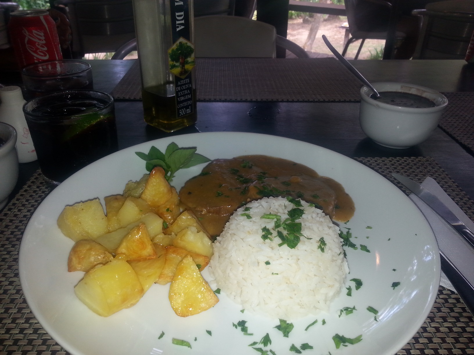 Comemos um delicioso lagarto ao molho madeira, com arroz, batata sotê e feijão preto. Estava uma delícia!