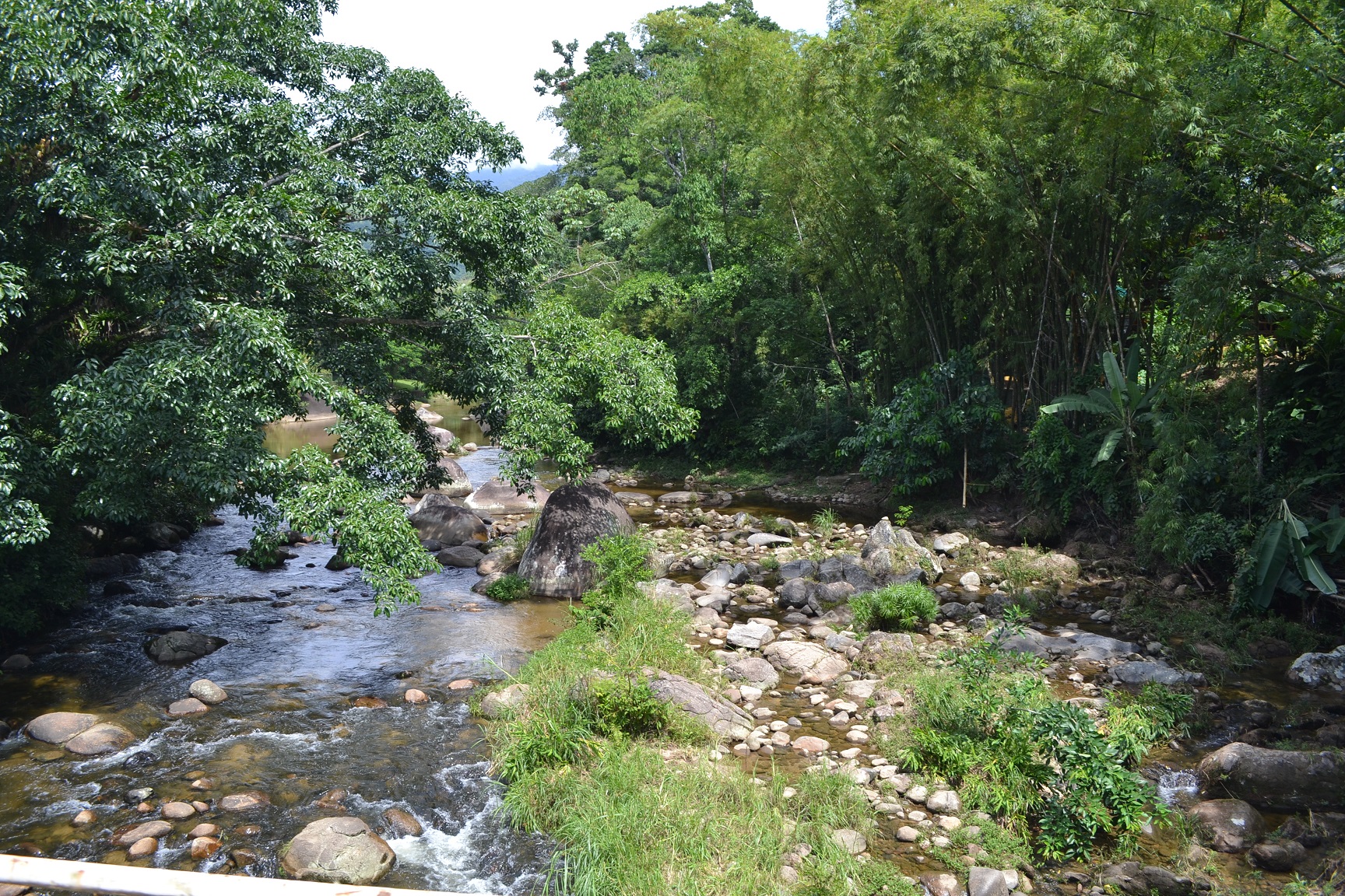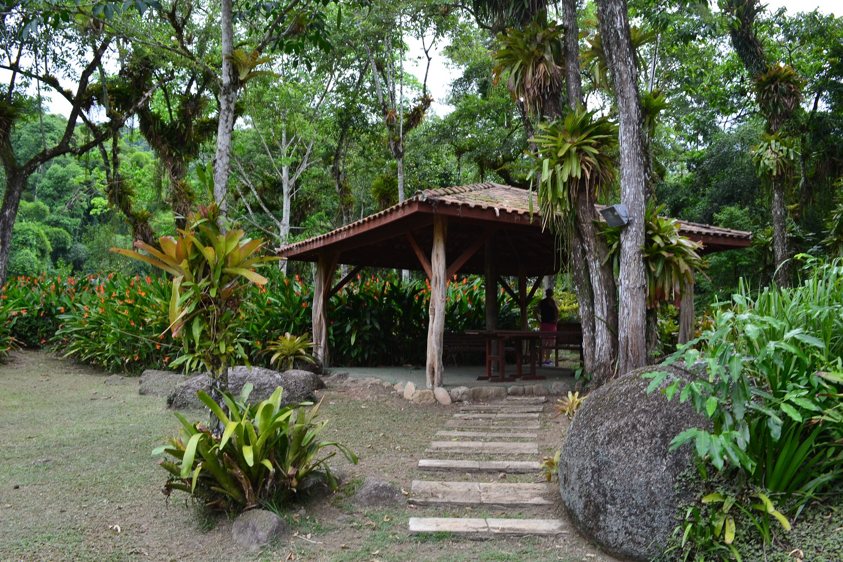 Logo na entrada, passamos por uma ponte que corta um dos rios da região e chegamos a um ambiente cercado por flores e matas, e ainda com quedas de cachoeiras do lado direito.