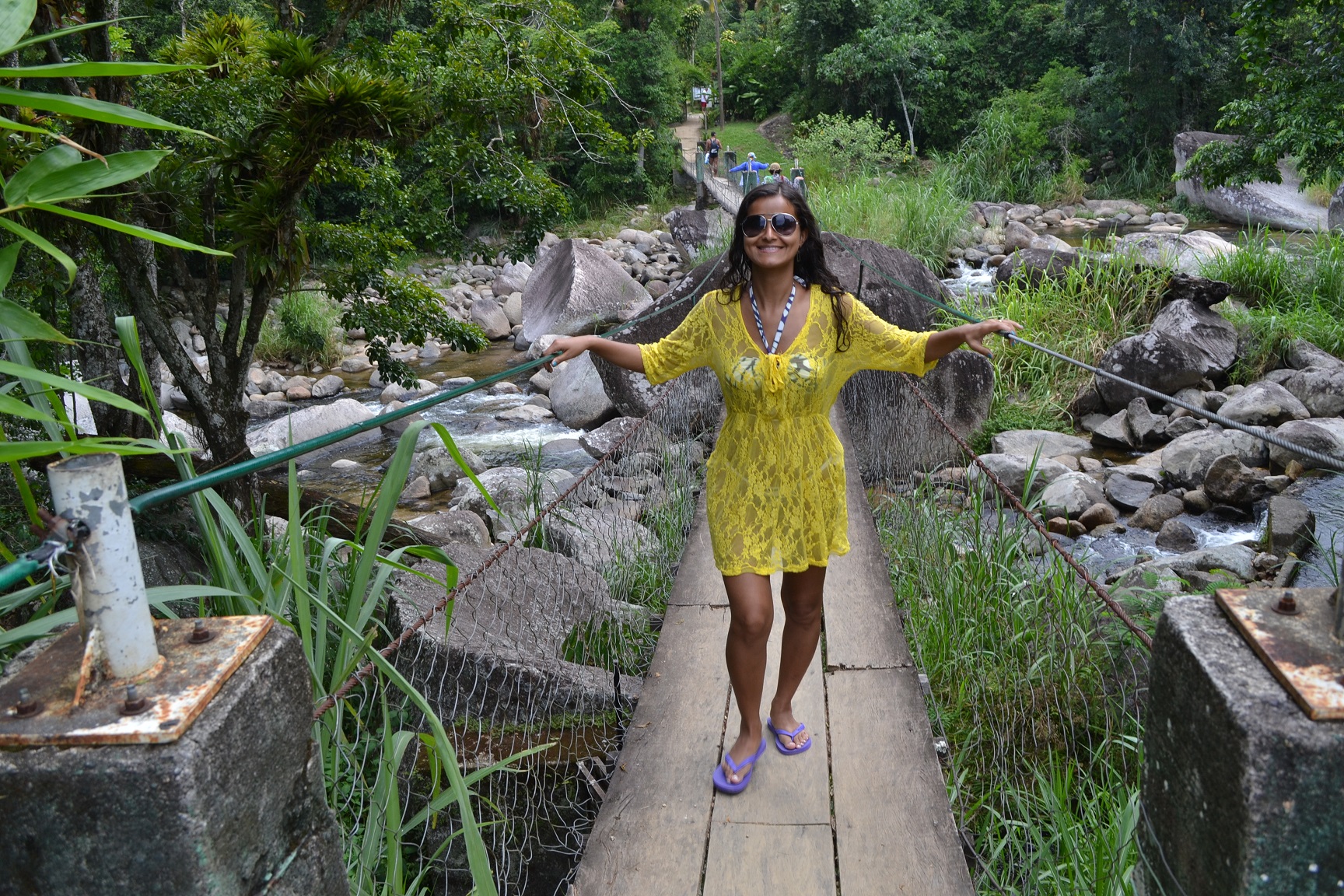 Ao chegar no local é possível observar uma ponte suspensa sobre o córrego da cachoeira com o Bar do Tarzan no final.