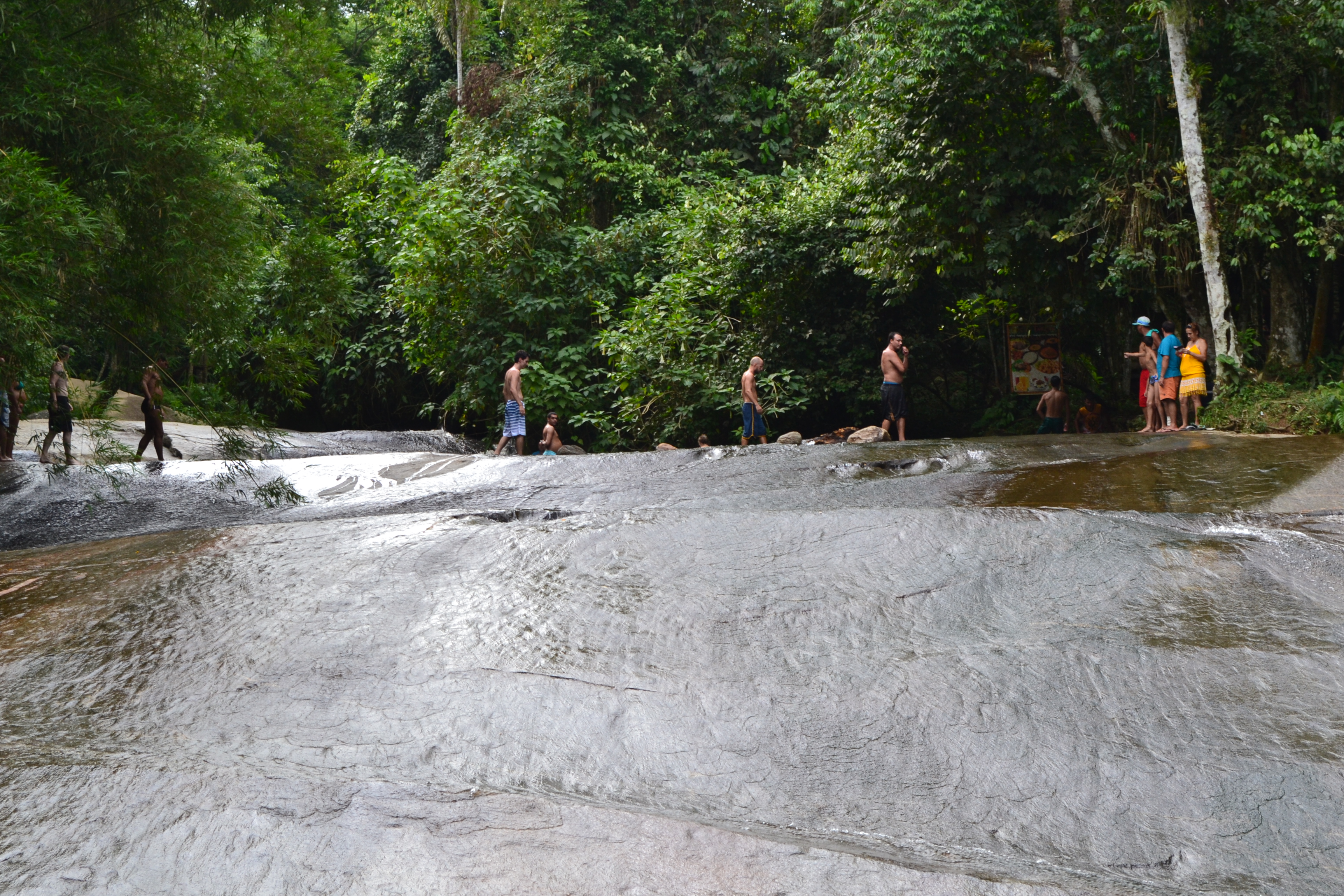 Três saltos formam duchas naturais e um “escorrega” perfeito que termina em uma piscina. O pessoal desliza de pé sobre a imensa pedra lisa, praticando o “surf de cachoeira”. Para evitar acidentes, é mais prudente descer sentado.