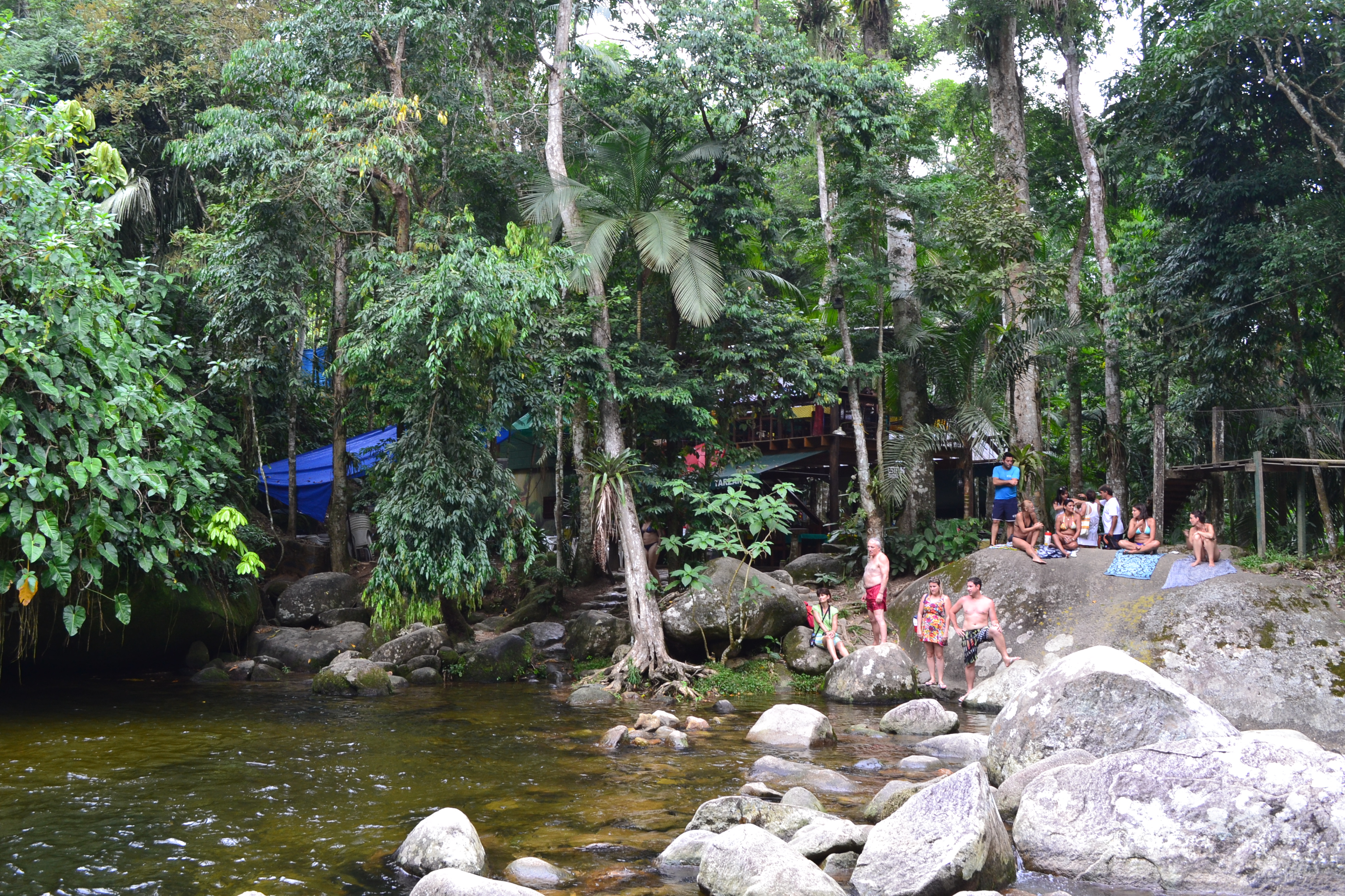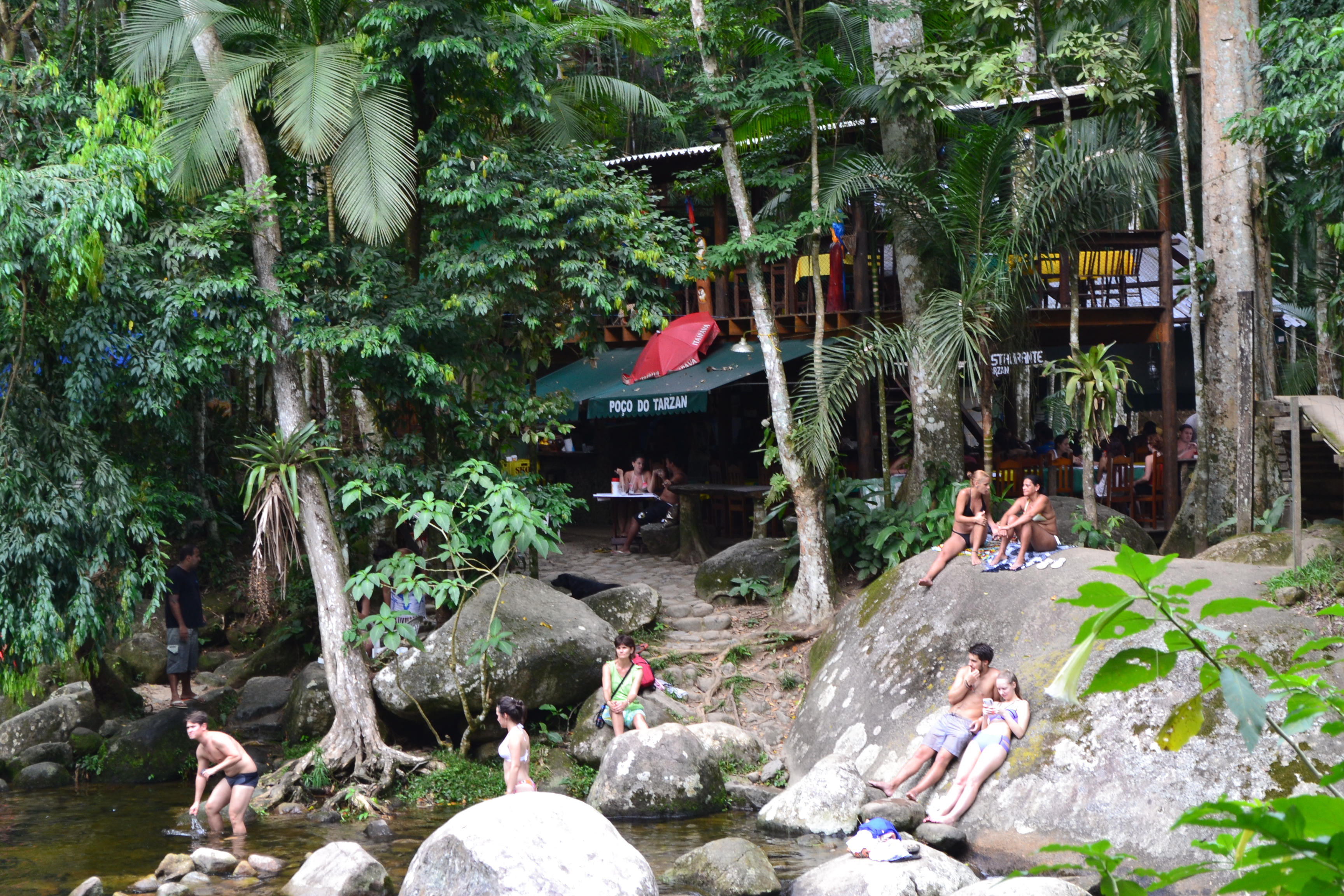 Em frente é possível checar uma gigantesca pedra de com certeza mais de 15 metros de altura, onde os corajosos sobem e pulam lá de cima, caindo no lago abaixo.