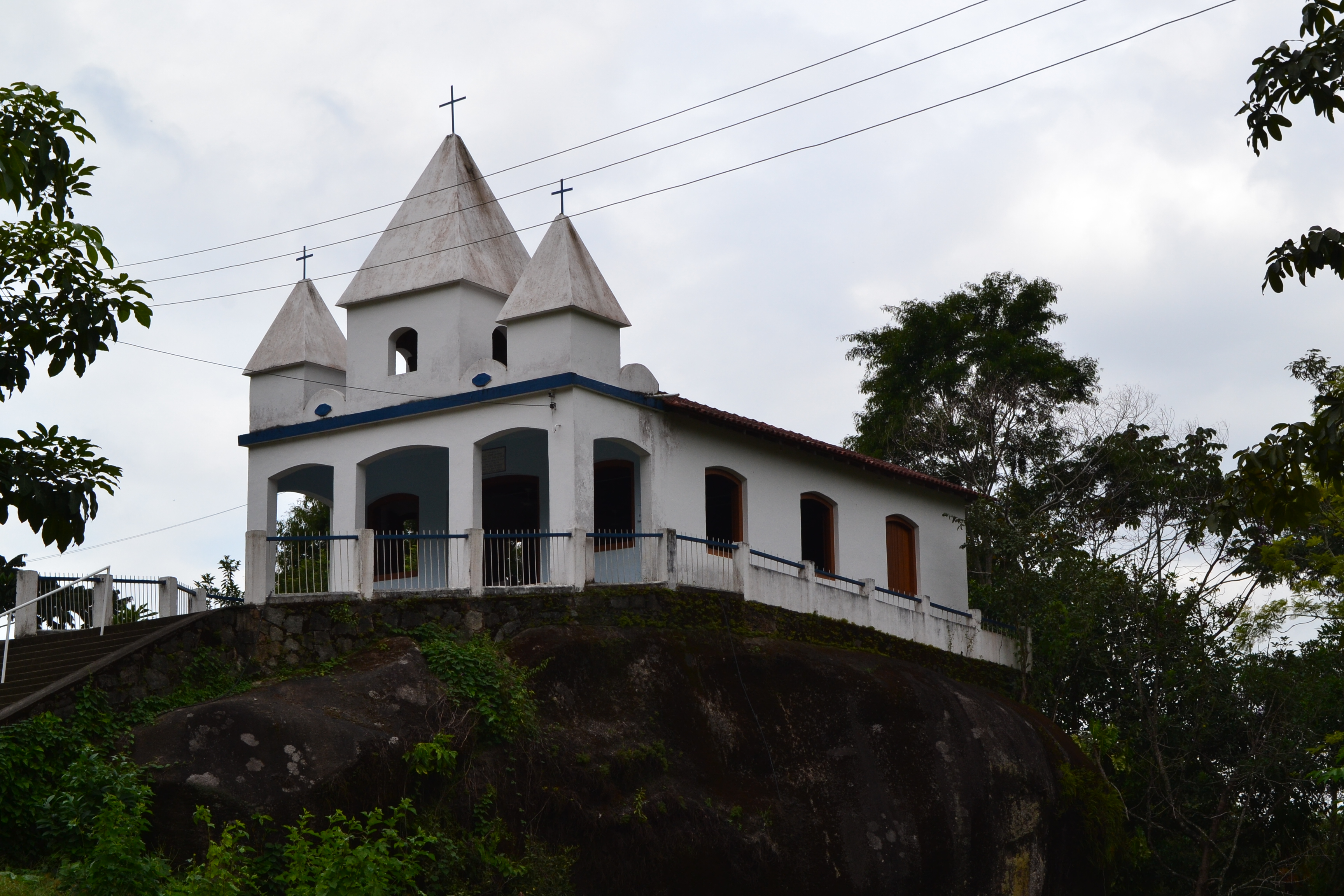 Logo no estacionamento, antes de entrarmos na trilha limpa e bem sinalizada que leva as cachoeiras, avistamos a Igreja da Nossa Senhora da Penha construída sobre uma gigantesca rocha! Sensacional como construíram uma igreja sobre esta imensa rocha.
