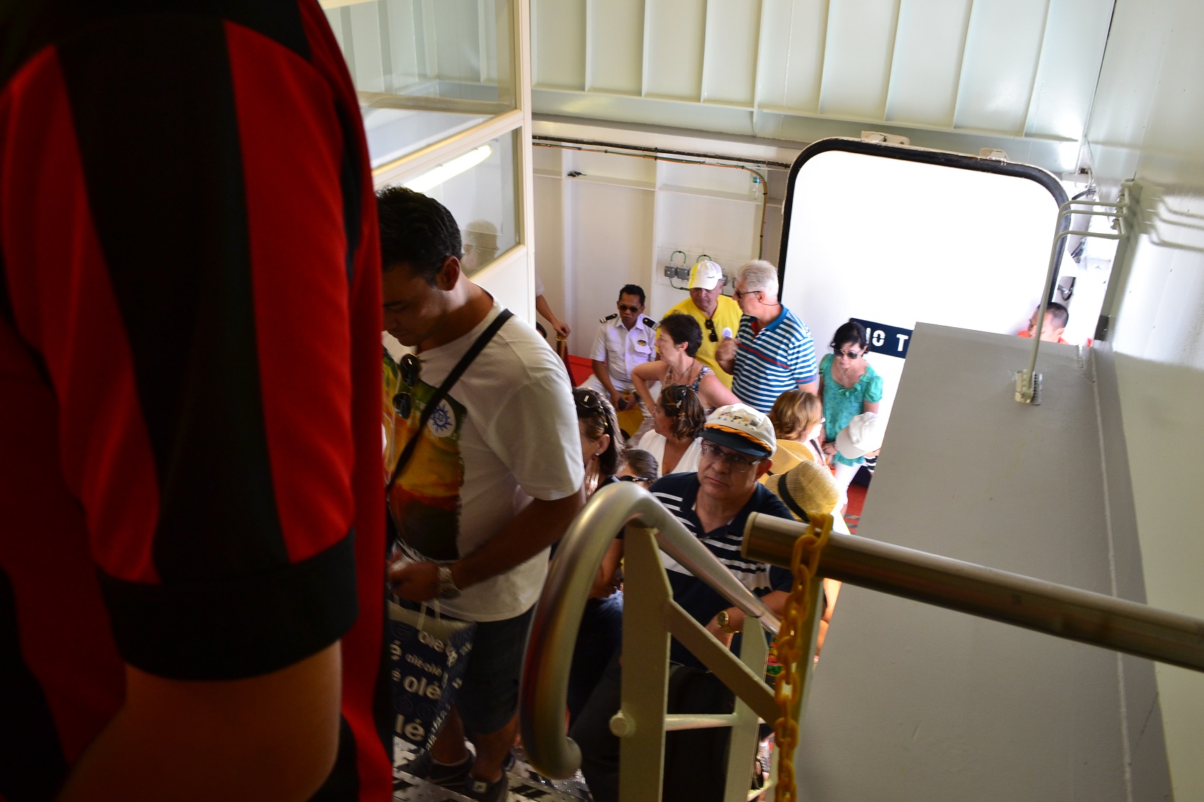 Voce terá que desembarcar com as pessoas. Saem dezenas de balsas. Depois elas ficam fazendo a travessia de quem quer voltar.