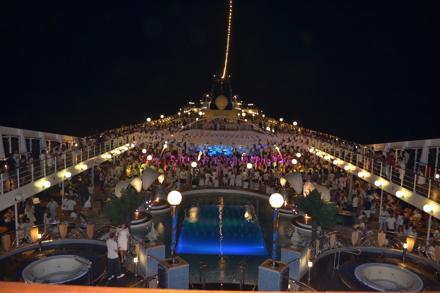 Após o jantar nos dirigimos para a festa do branco no Deck da Piscina. Festa bem badalada, mas estava ventando muito, então estava difícil ficar por lá. As mulheres que estavam com saia ou vestido e com cabelo feito, sem dúvida ficou despenteada e tendo que cuidar para que nada voasse.