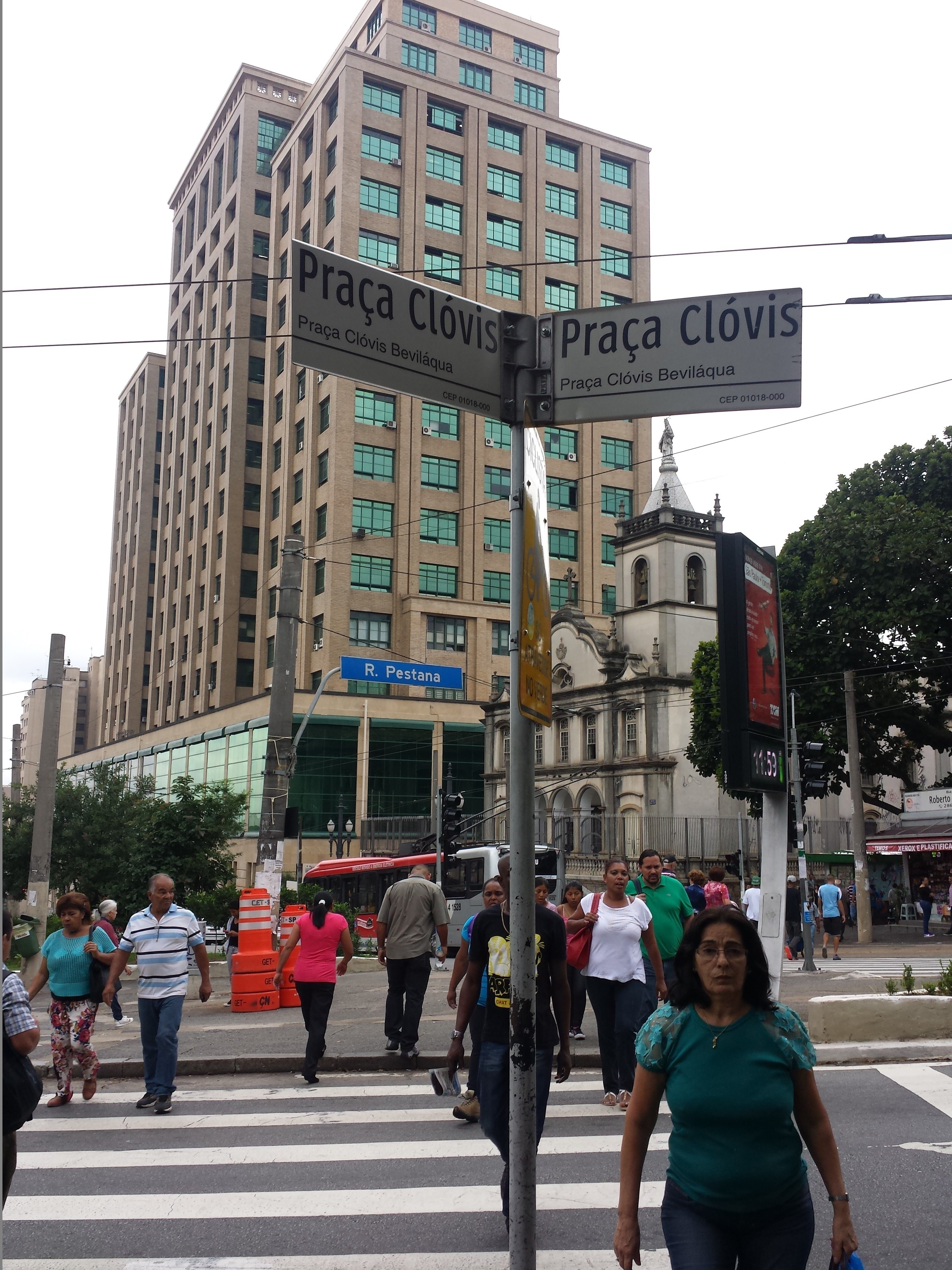 Depois de atravessar a rua, mantendo-se sempre à direita, você irá se deparar com um comércio ambulante de alimentos e bugigangas. O prédio de seu destino estará à esquerda!