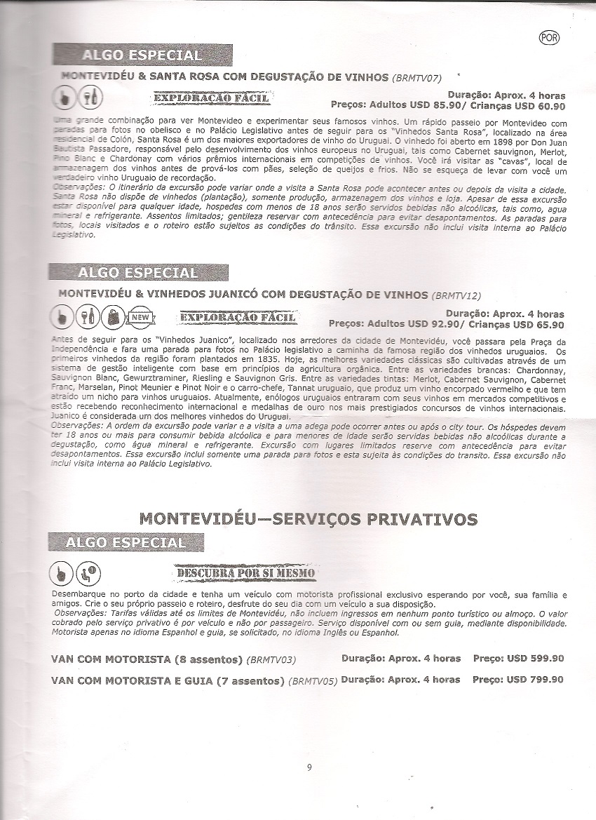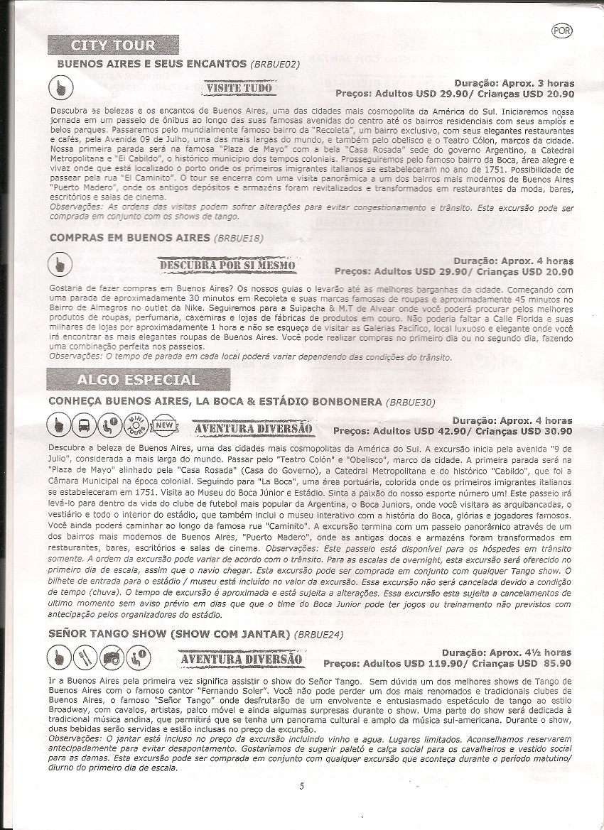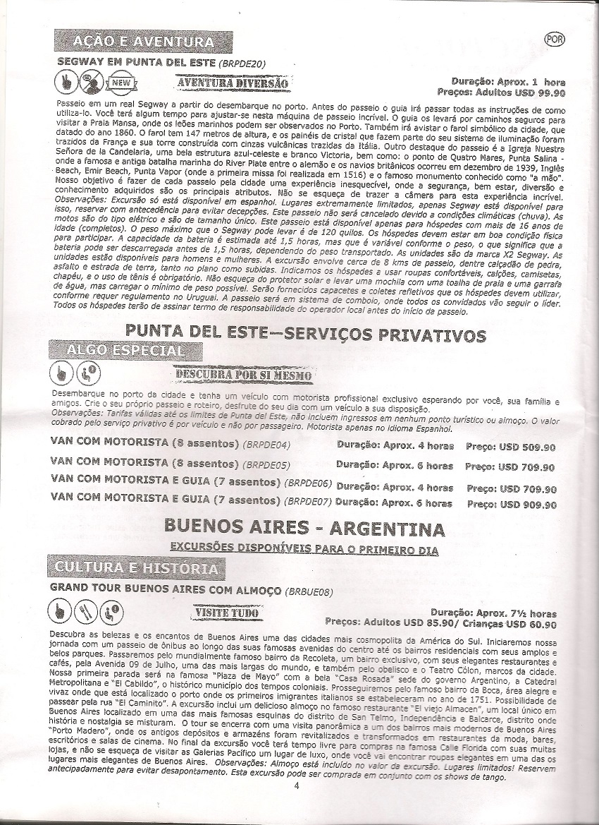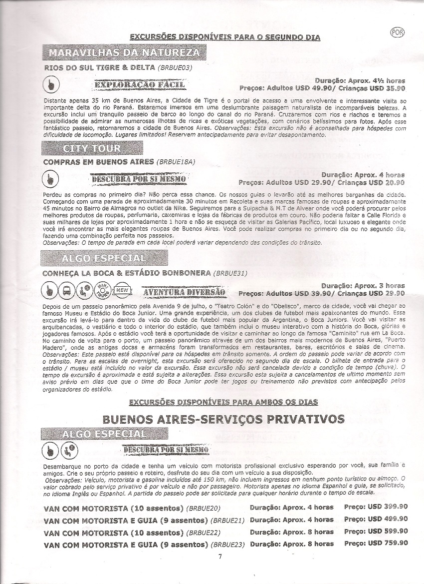 Nós sugerimos radicalmente que nenhum, literalmente nenhum passeio seja fechado com a operadora de turismo que vai lhe vender o pacote do cruzeiro e tampouco dentro do navio, pois os valores são absurdamente altos.