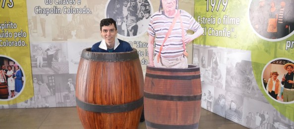 Logo na entrada, há o famoso barril do Chaves para foto, com a história em totens no entorno do mesmo, contado através de um voo panorâmico tudo o que se passou na história dos personagens do Chaves.