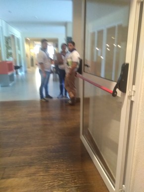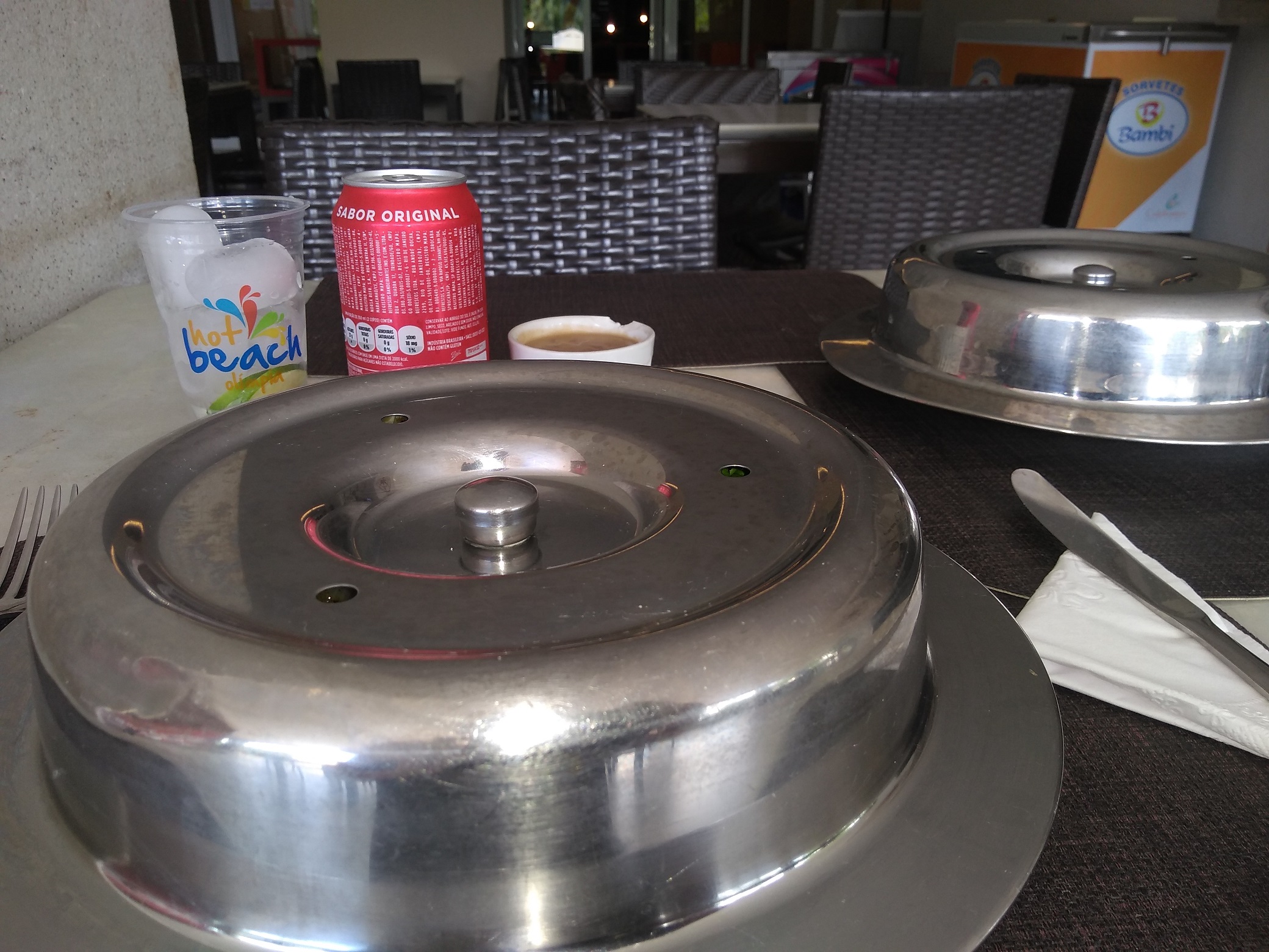 Tentei tirar uma foto sem perceberem, mas não ficou muito boa. Nesta foto, estávamos dentro do restaurante, saindo para a área externa. Obrigatoriamente teríamos que passar pela porta, logo, não tinha como evitar a abordagem…