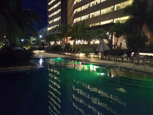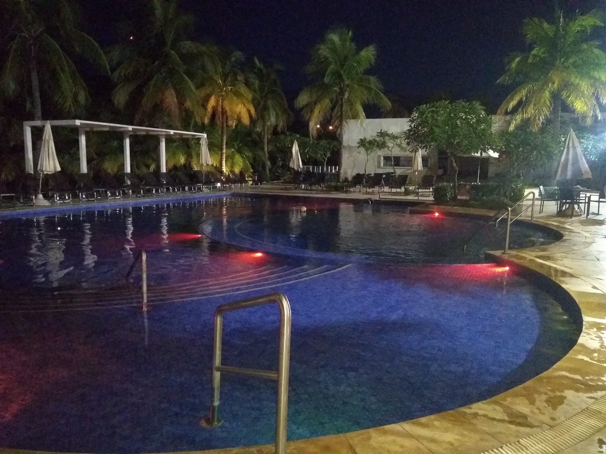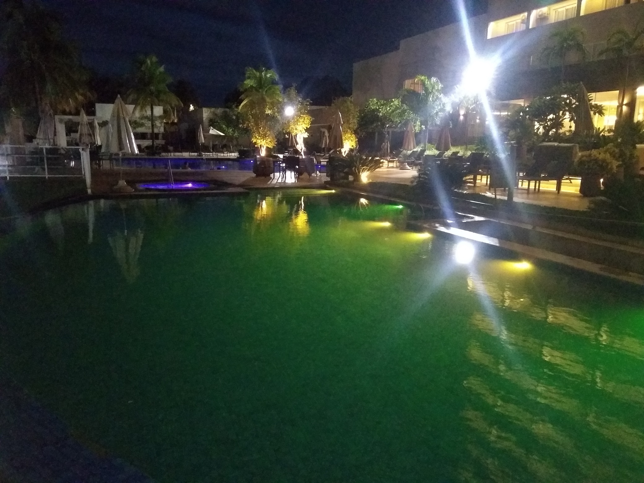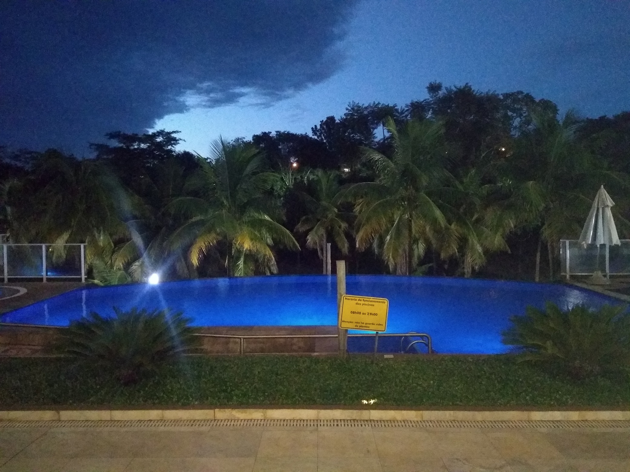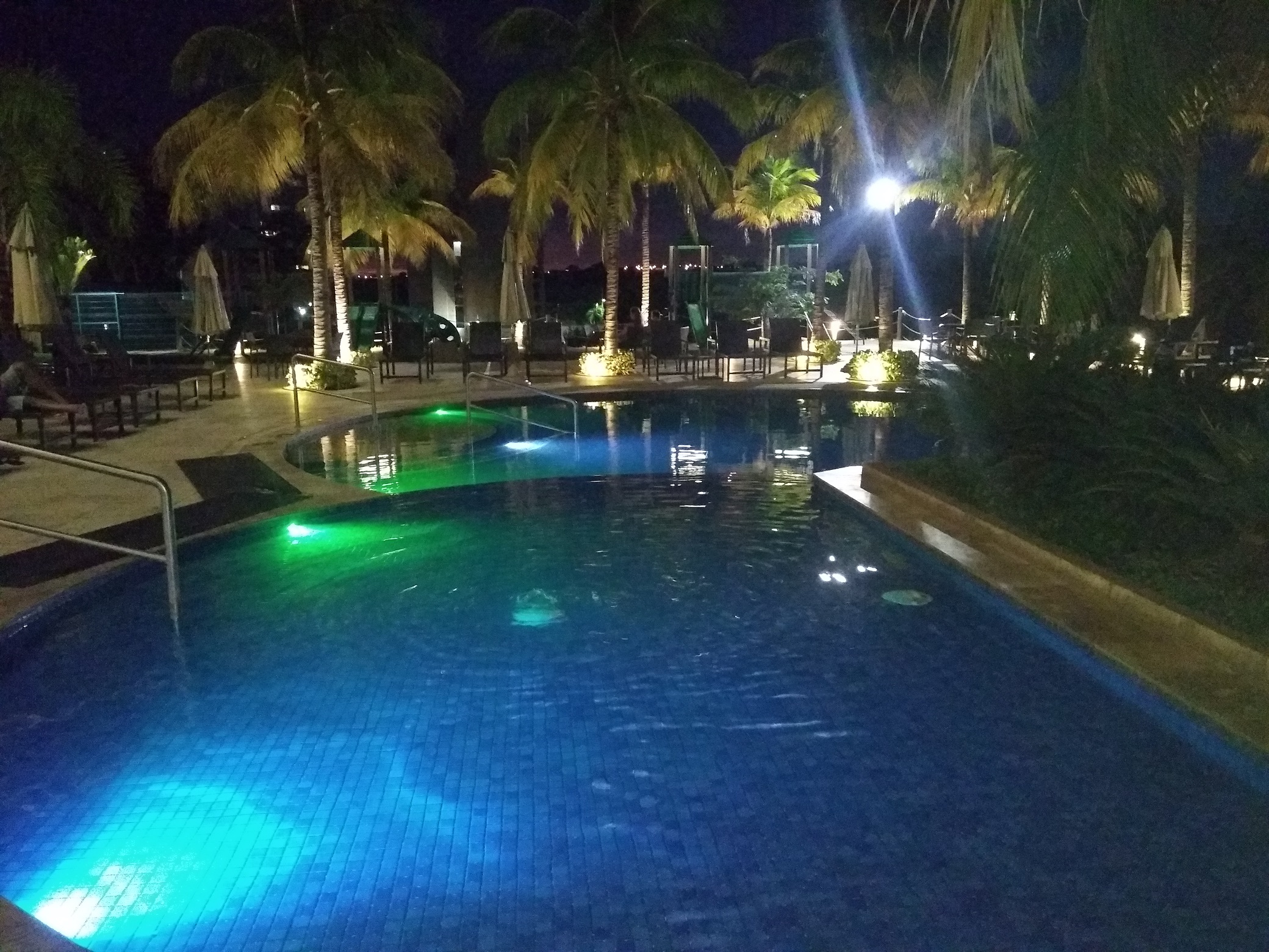 À noite, as luzes na piscina são ligadas, fazendo com que haja literalmente um show de cores nas águas.