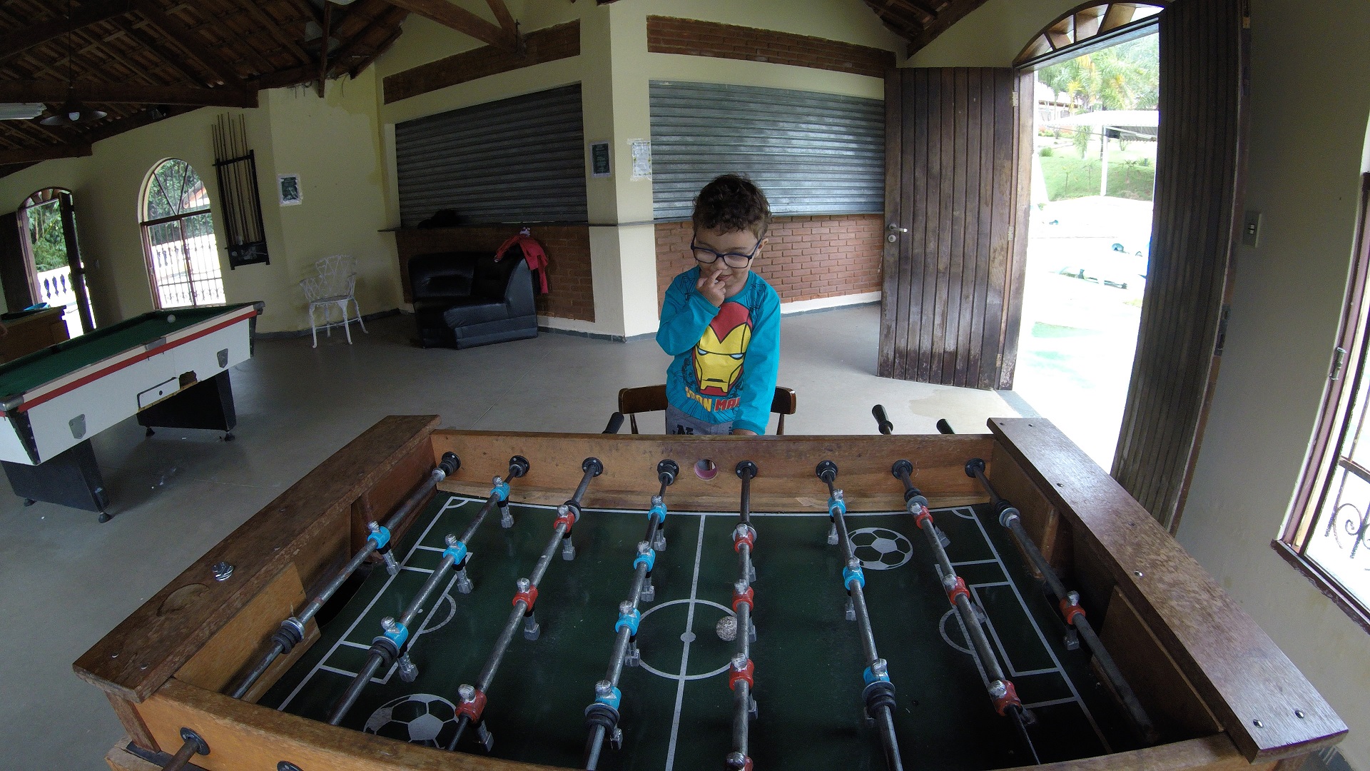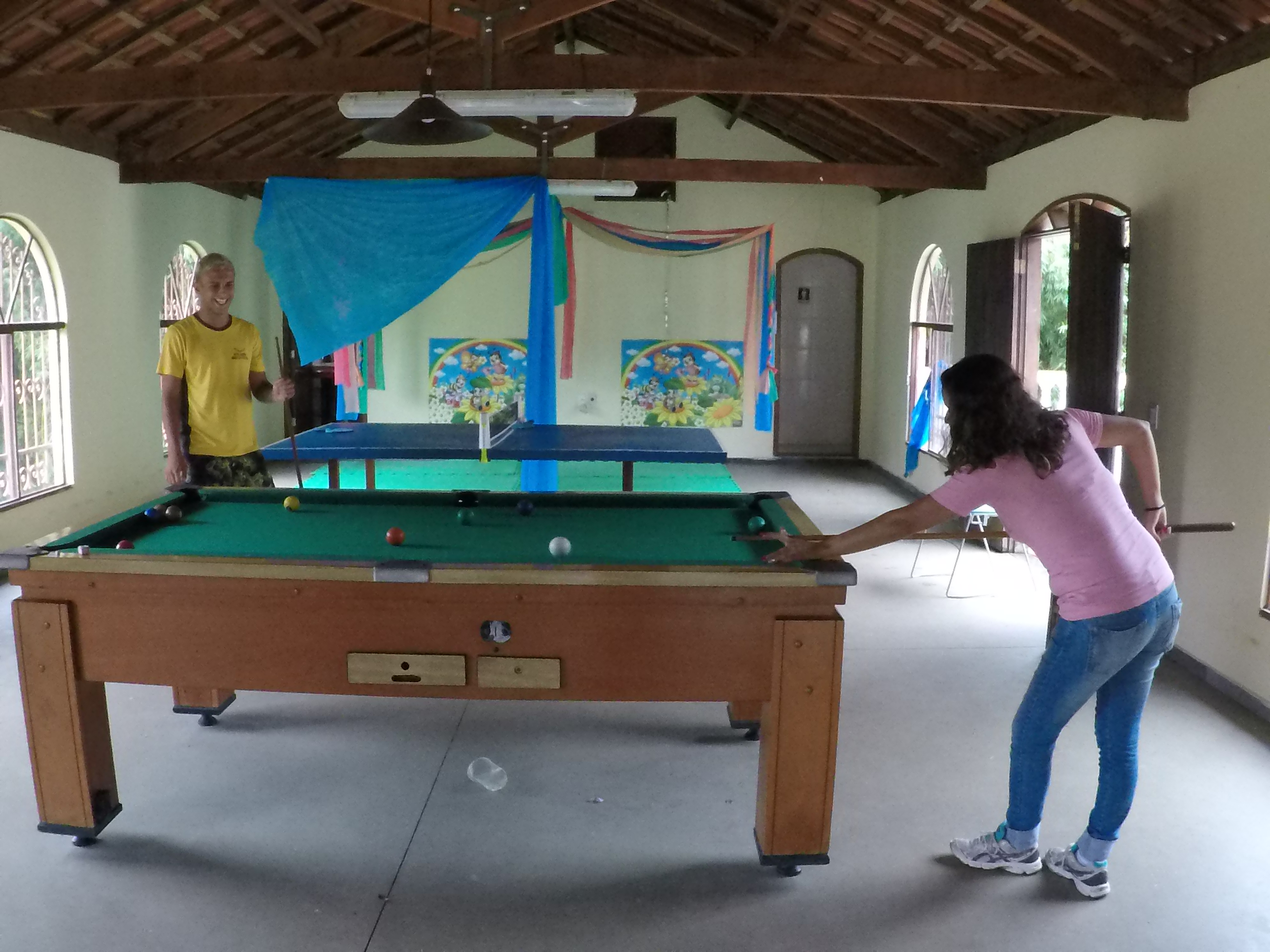No salão de jogos há uma mesa de pebolim, 2 de sinuca e uma de ping pong.