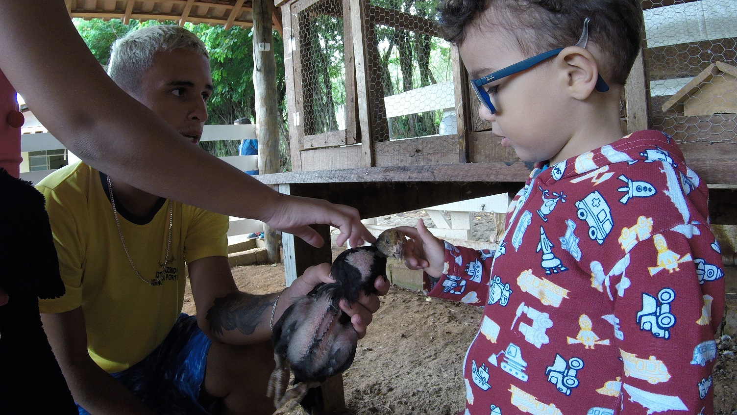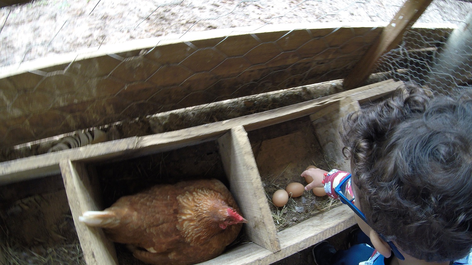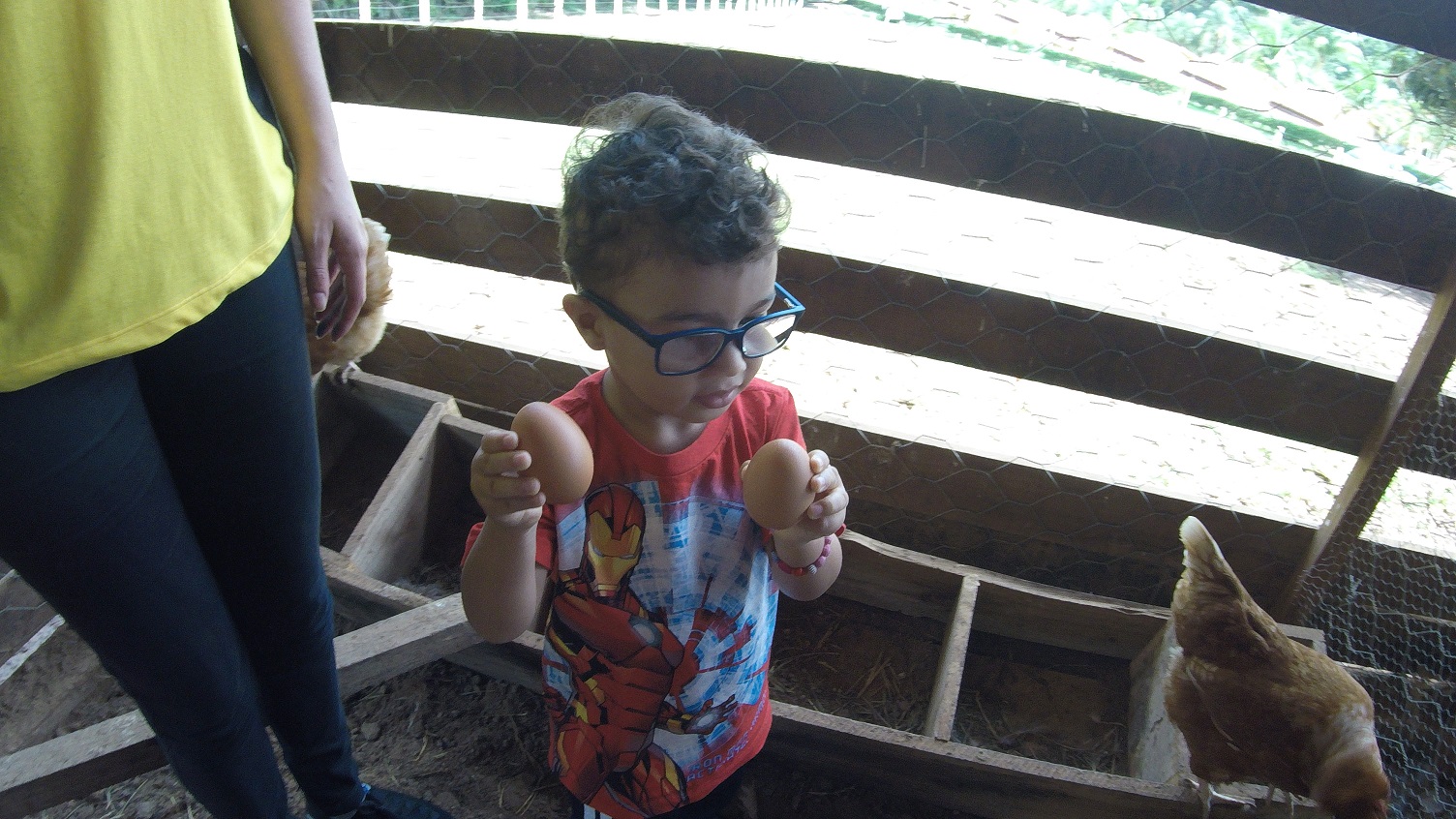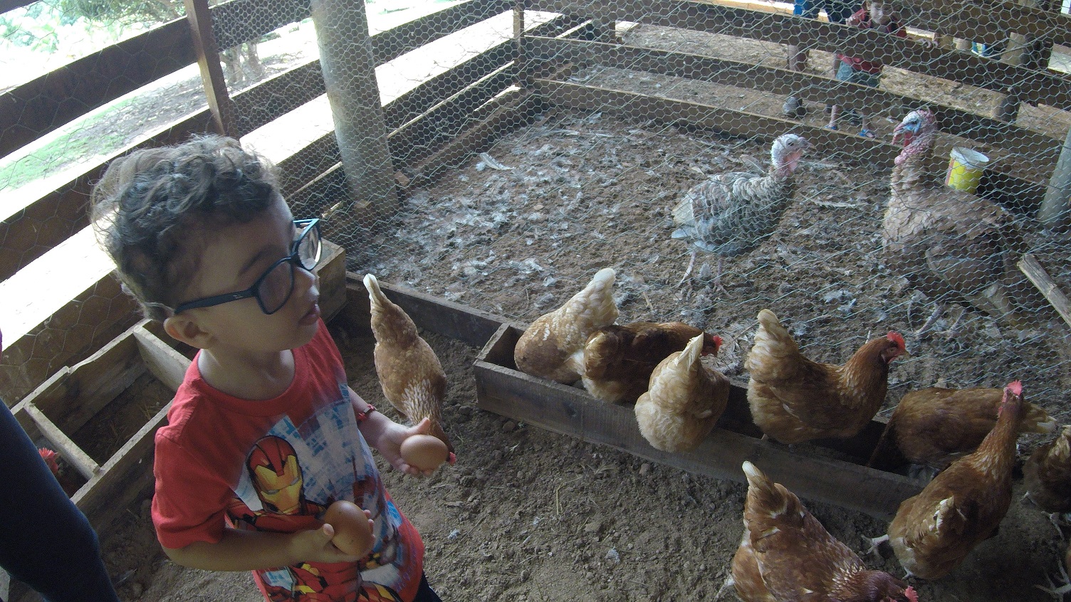 Nessa parte eu achei que o Arthur ficaria com medo, pois eram algumas dezenas de galinhas no galinheiro, mas ele não pensou em nenhum momento e entrou direto.