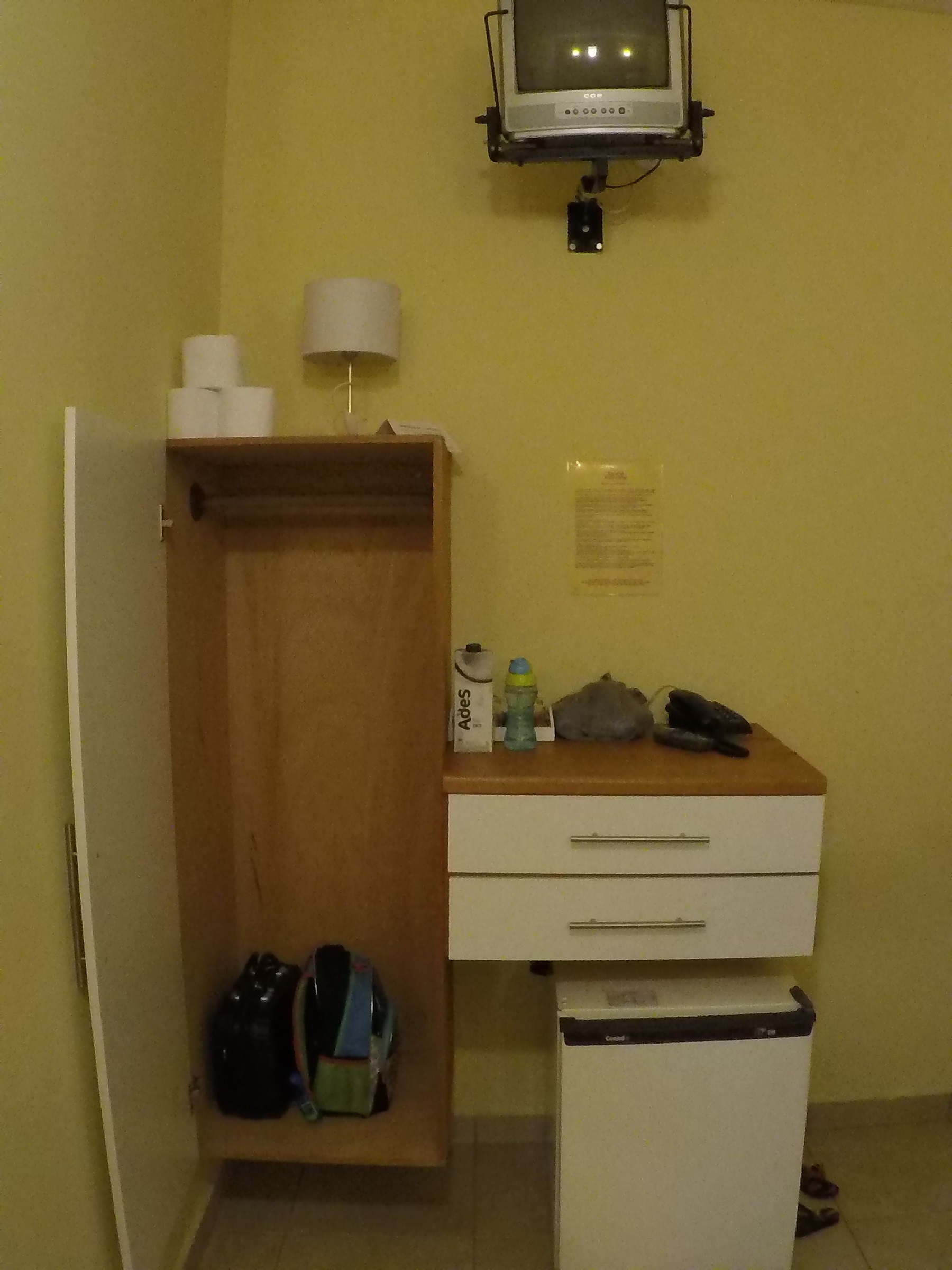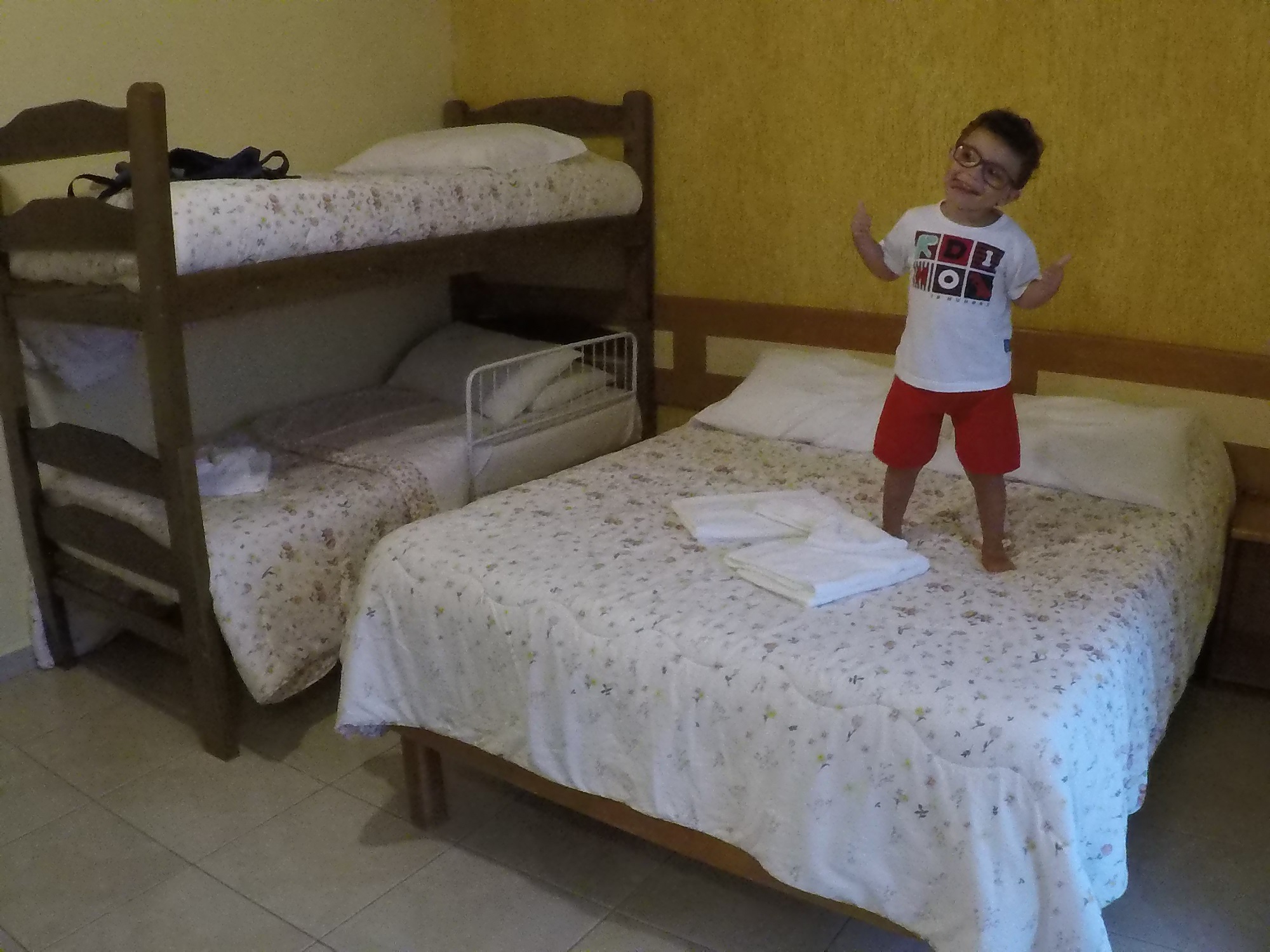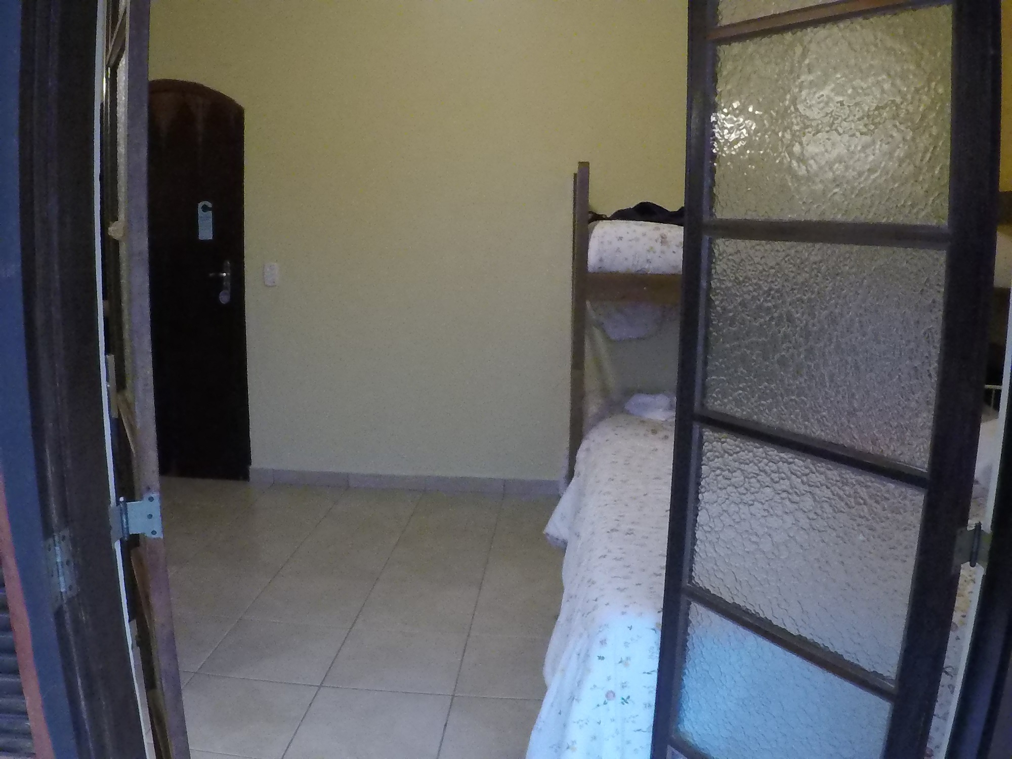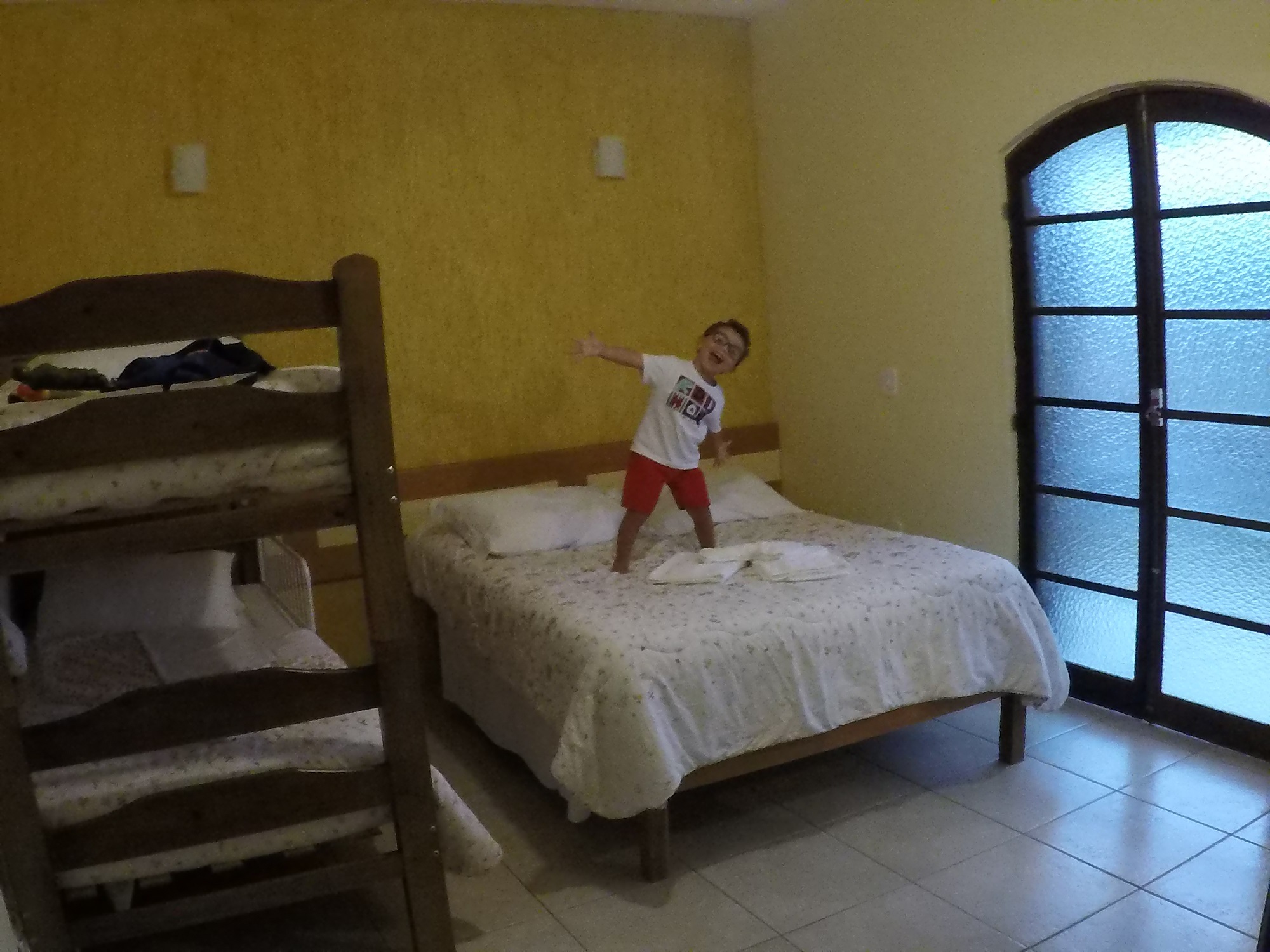 Ficamos bem impressionados com o tamanho e disposição do quarto. Tem um beliche e uma cama de casal, com um pequeno frigobar e armário para as roupas e malas. O banheiro também é bem espaçoso. Há uma sacada com visão para todo o estabelecimento.