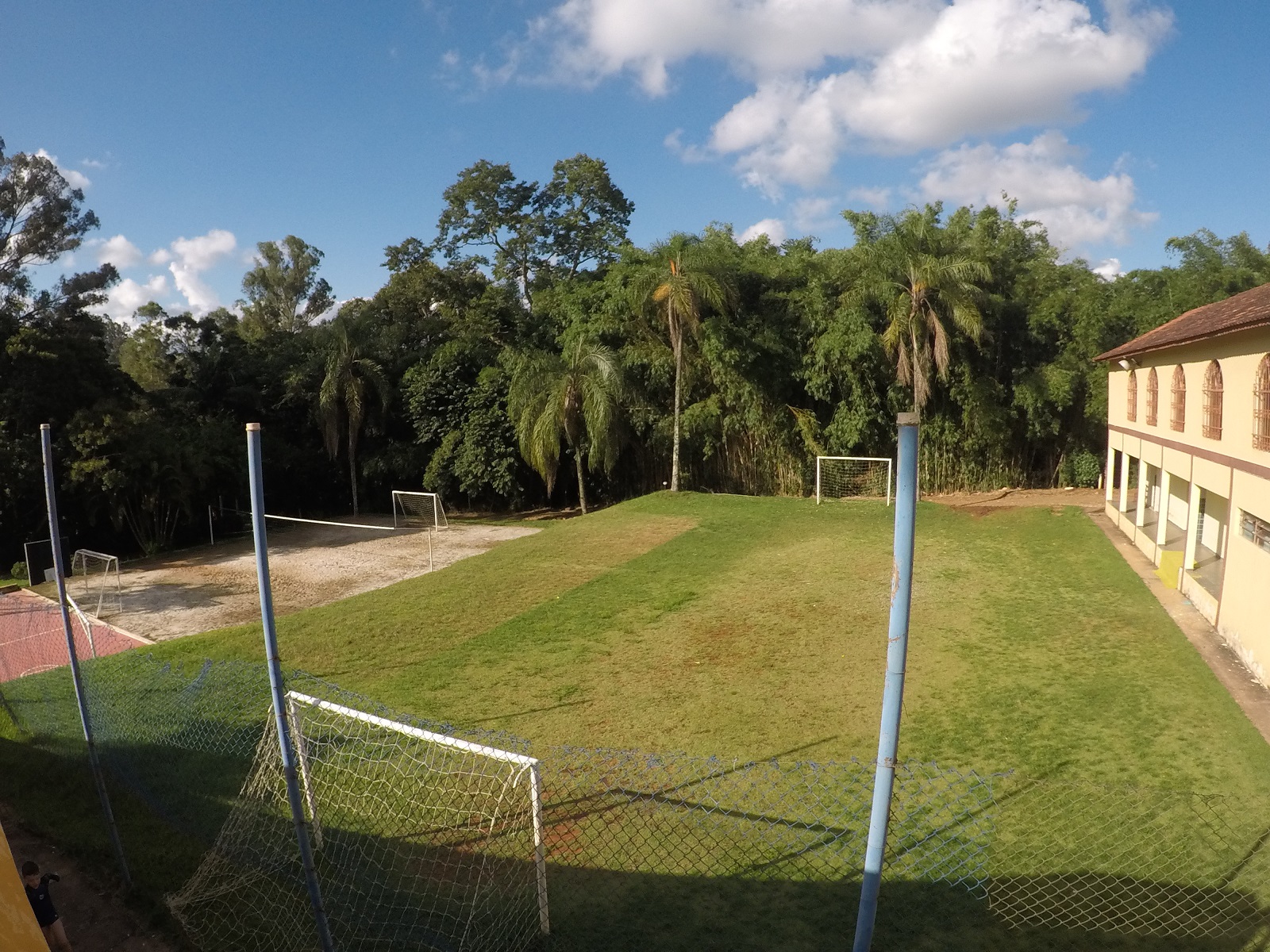 Logo que passamos pela entrada, já visualizamos o parquinho no centro, ao lado esquerdo a tirolesa e parede de alpinismo. Em frente o toboágua e também a quadra de futebol e vôlei.