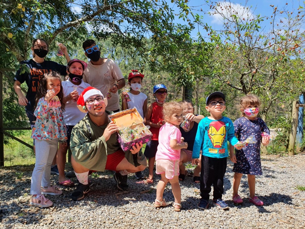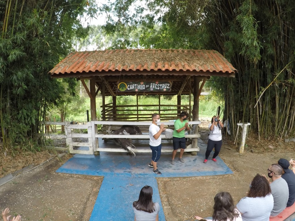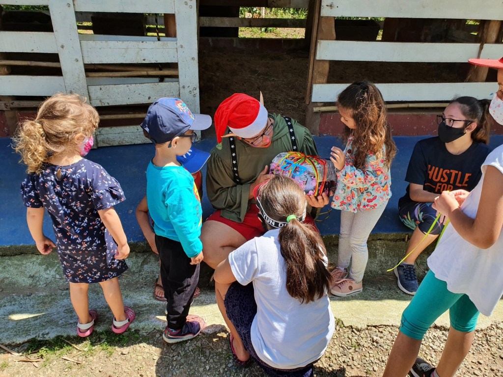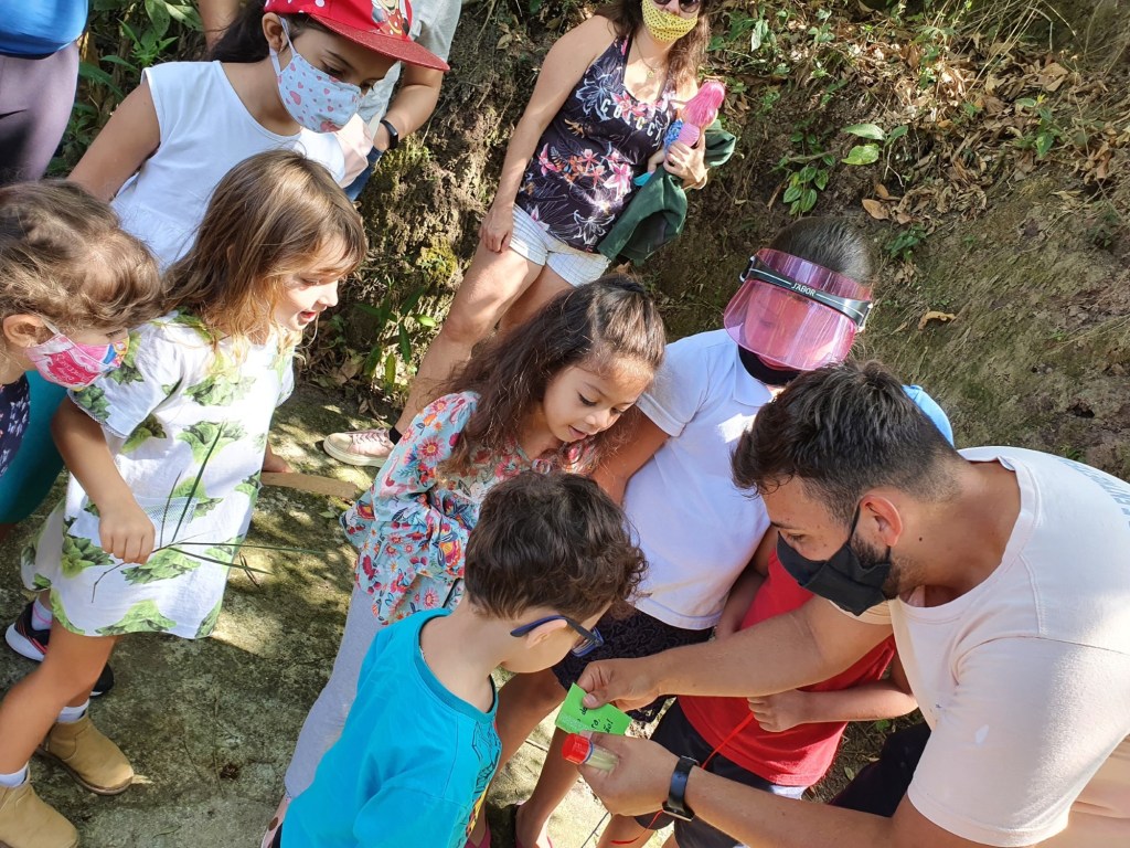 Eles ofereceram para as crianças explicação do que era uma trilha ecológica, o que seria uma bica de água e falaram sobre as nascentes e também nos acompanharam na visita a fazendinha e alimentação dos animais!