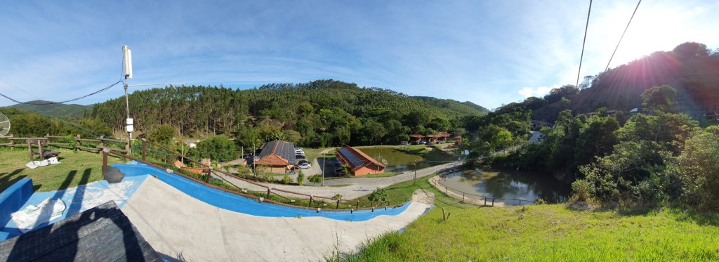 Fica no topo de um dos vales. A visão ali de cima é sensacional, coisa de outro mundo! Em um fim de tarde, eu fiquei reparando que as árvores no topo da outra colina, com o vento ficavam dançando de um lado para o outro. Muito bonito. E com toda essa visão, ali há um parquinho bem preparado para atender as crianças.