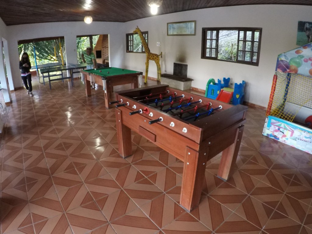 Salão bem completo, com mesa de pebolim, mesa de bilhar, mesa de ping pong e uma cama elástica bem grande. A piscina de bolinha estava inativada, para proteção contra a COVID.