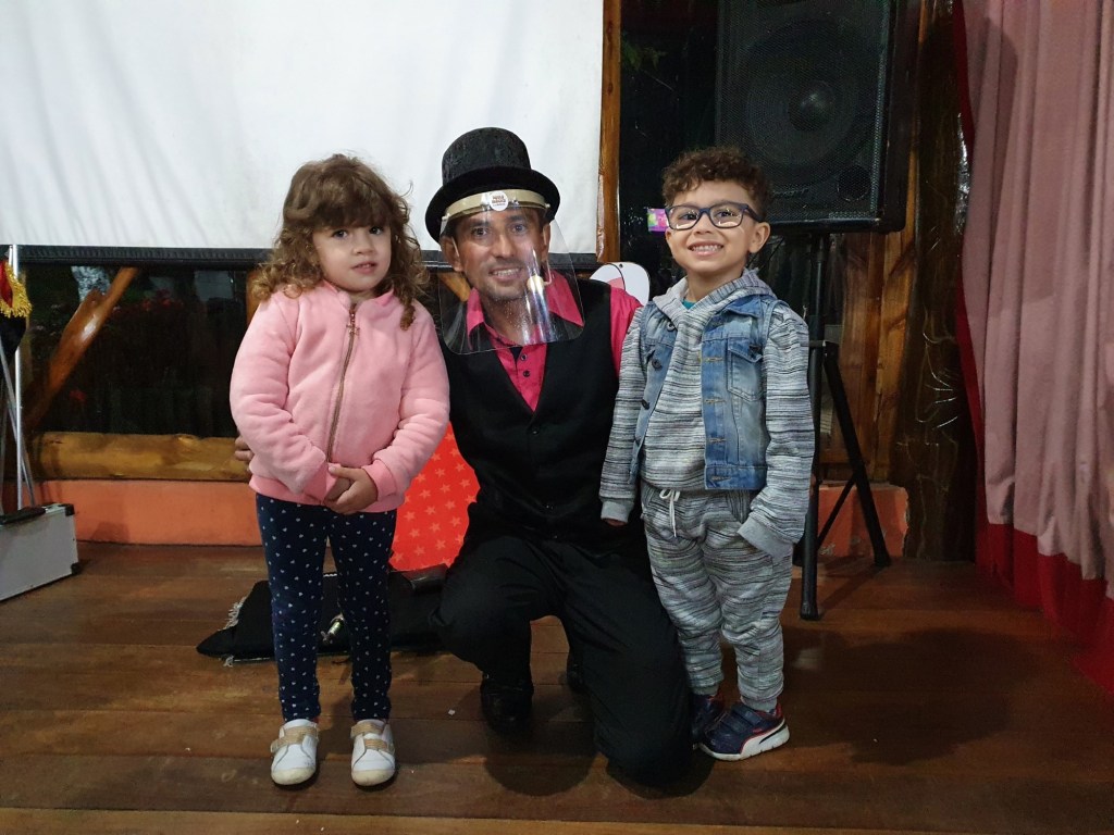 O mais legal é que logo no inicio, quando o mágico chegou, nós sentamos na primeira mesa e o Arthur sendo ele mesmo, já foi lá conversar com o mágico e se apresentar! Ali já rolou uma interação. A Analu (amiguinha dele, filha do nosso casal de amigos) o acompanhava o tempo todo e juntos ganharam o mágico que os chamou para participar do show!!!
