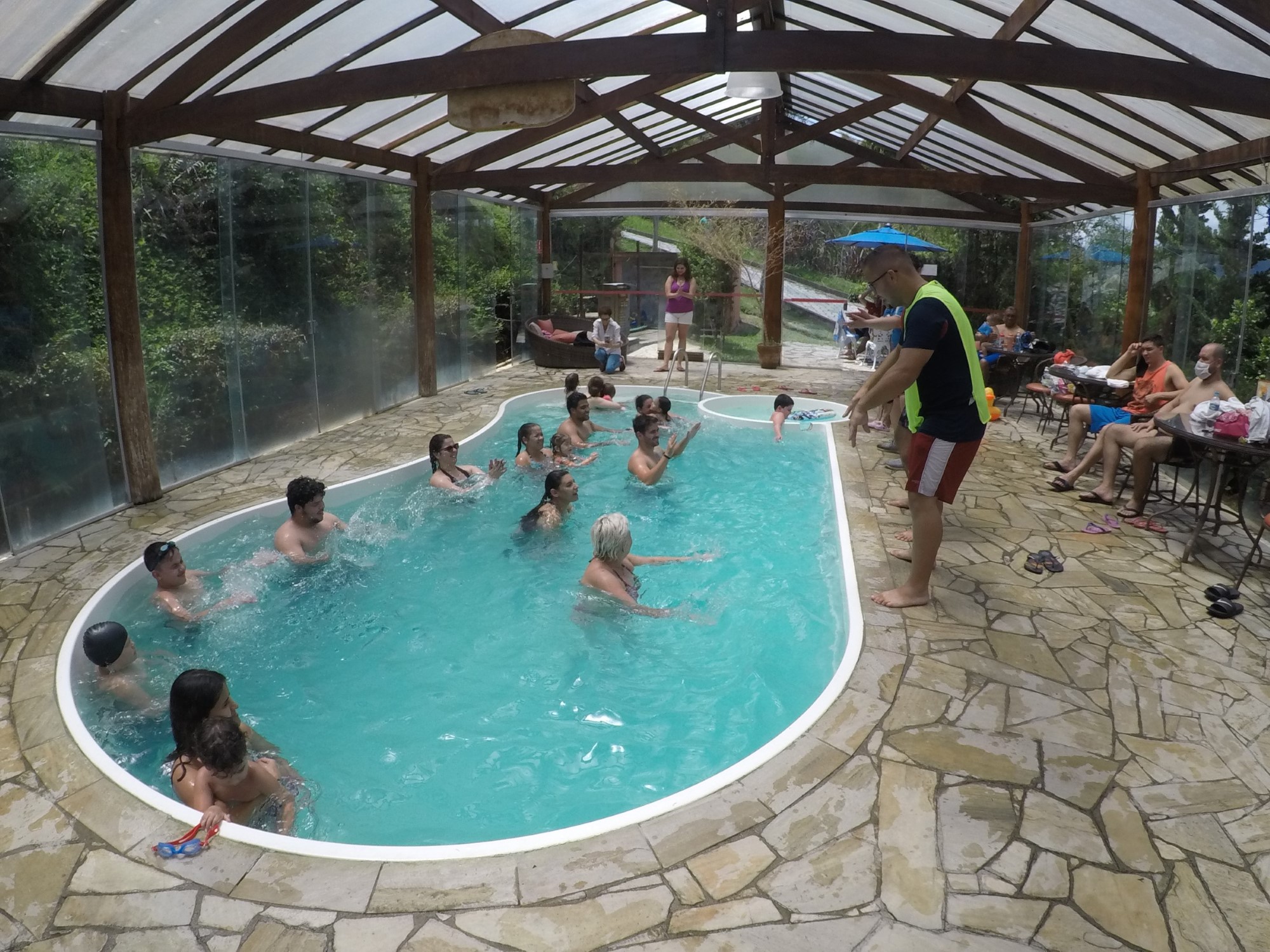 Apesar de pequena, realmente é bem quente. Nos dias de calor era até complicado ficarmos dentro da água. O espaço é todo fechado por vidros, por conta da COVID e também por conta do calor, as janelas ao longo do dia ficavam totalmente abertas e no fim da tarde eram fechadas.