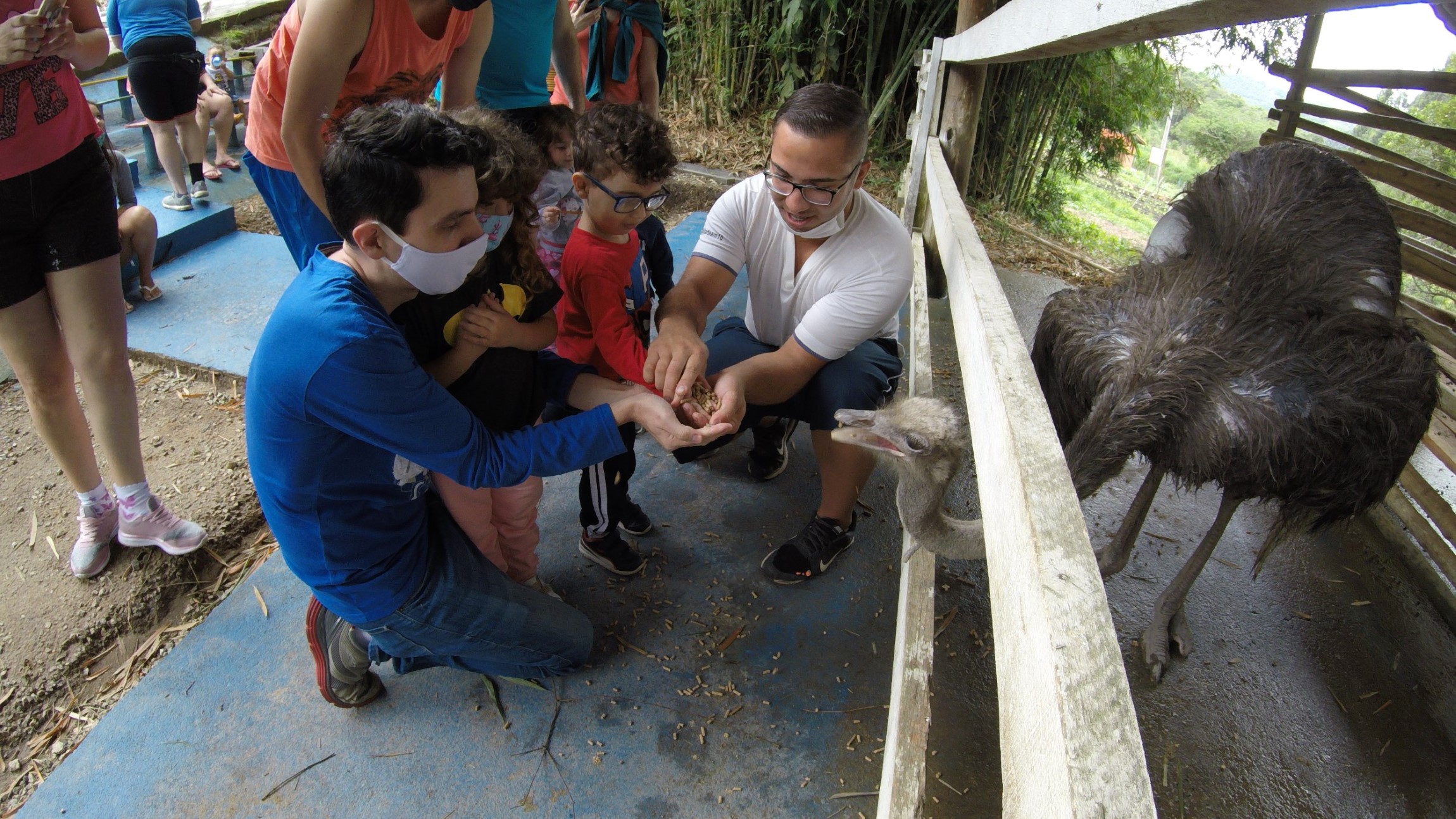 Eles ofereceram para as crianças explicação do que era uma trilha ecológica, o que seria uma bica de água e falaram sobre as nascentes e também nos acompanharam na visita a fazendinha e alimentação dos animais!