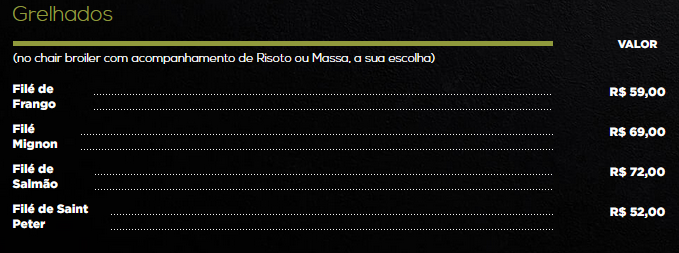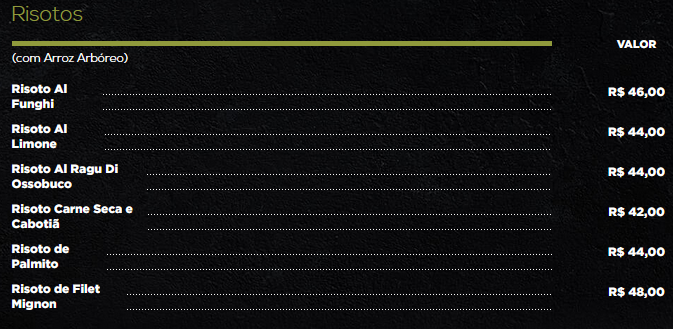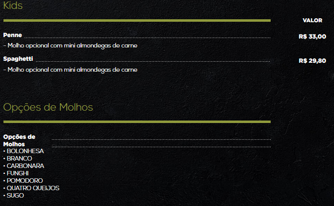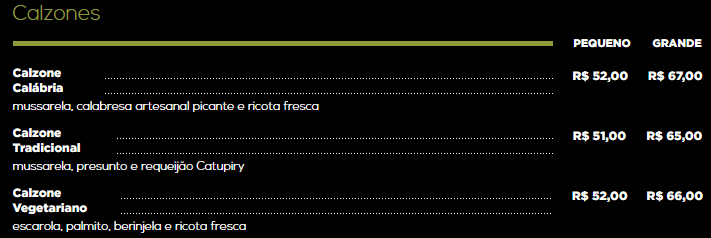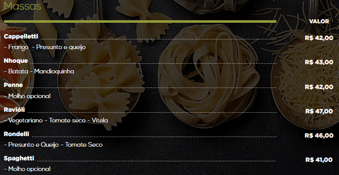 O menu é dividido em: entradas, massas, risotos e grelhados, pizzas e calzones, sobremesas, bebidas em geral e vinhos.