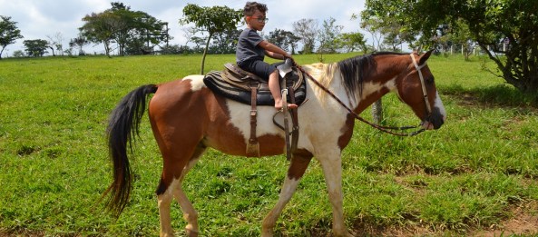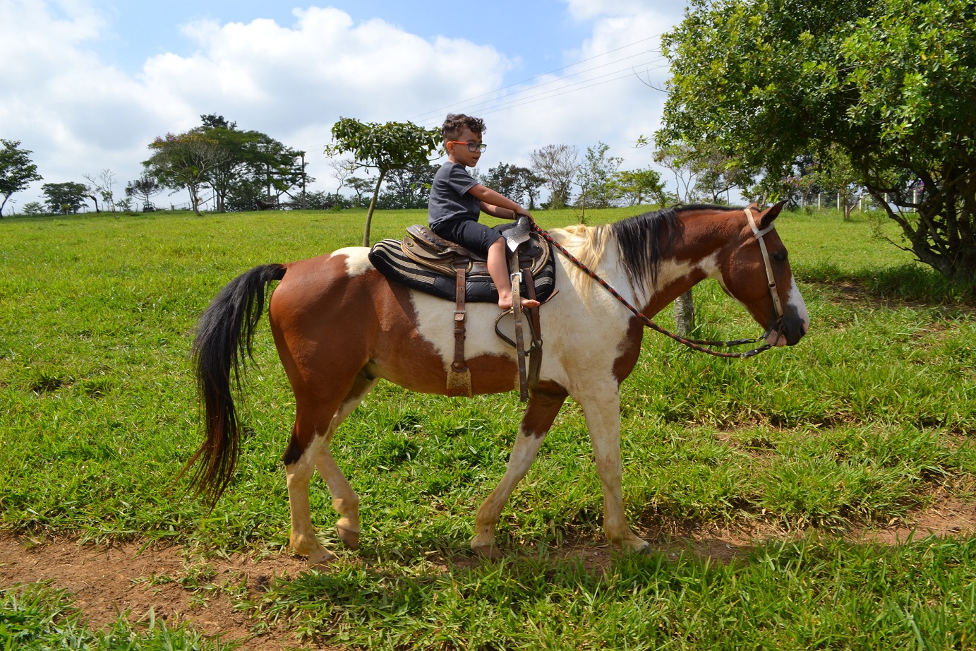 Todos os dias pela manhã é disponibilizado o passeio de cavalo de forma gratuita. O passeio dura cerca de 20 a 25 minutos, dando esta volta na fazendinha que fizemos a pé mas de cavalo. O Arthur conseguiu ir sozinho em cima do cavalo. Eles são dóceis e ensinados, então o instrutor nem precisa segurar, o cavalo por si só vai seguindo o caminho.