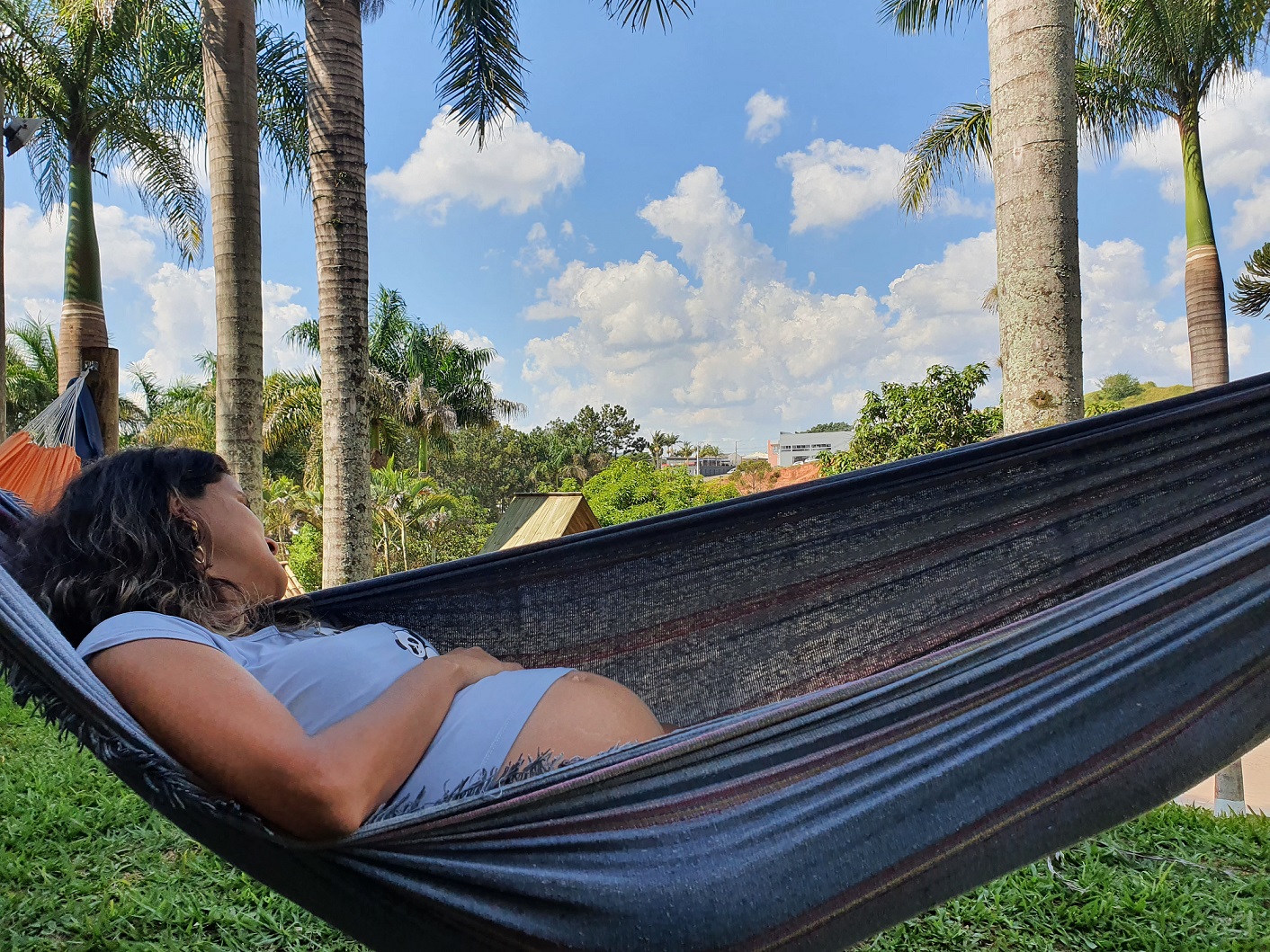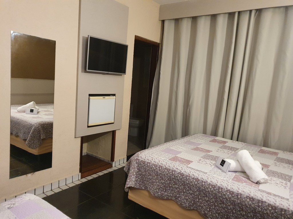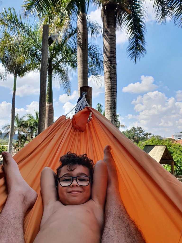 O quarto é realmente bem espaçoso, tem um cama Queen e outra de solteiro. O banheiro é espaçoso e ainda conta com uma varanda. Ficamos bem em frente ao redário o que facilitava a ida e vinda da mesma. O Arthur gosta muito de rede e na sexta que era ponte de feriado, a Paty ficou um tempo trabalhando do espaço enquanto o nosso quarto era limpo.