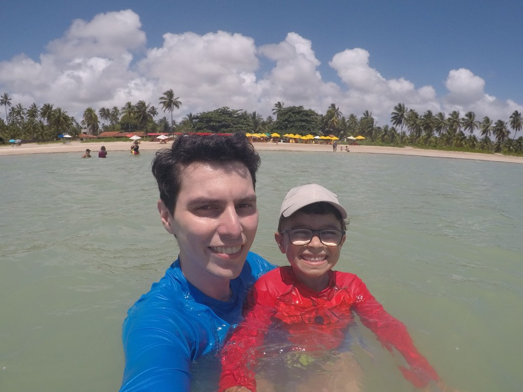 Pude ficar com o Arthur bem no fundo, sem risco nenhum. A água é bem quentinha e cristalina. Daria pra ficar horas por ali parado apenas admirando a paisagem. Fiquei inclusive pensando, que se tivesse levado um daqueles macarrões que permite ficar flutuando ou até mesmo uma bóia, em que fosse possível fixar o ponto com uma espécie de âncora, não haveria porque voltar para a faixa de areia. Para quem for visitar a praia, fica a dica!!!