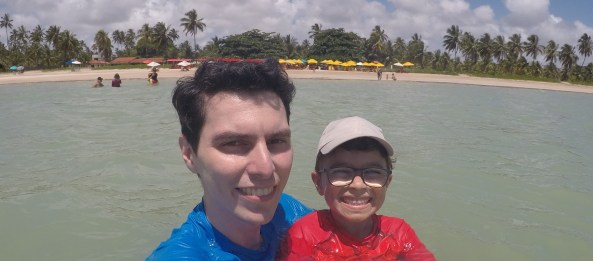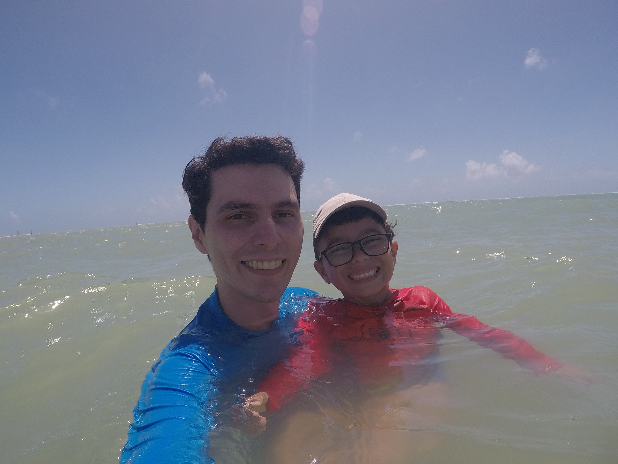 Pude ficar com o Arthur bem no fundo, sem risco nenhum. A água é bem quentinha e cristalina. Daria pra ficar horas por ali parado apenas admirando a paisagem. Fiquei inclusive pensando, que se tivesse levado um daqueles macarrões que permite ficar flutuando ou até mesmo uma bóia, em que fosse possível fixar o ponto com uma espécie de âncora, não haveria porque voltar para a faixa de areia. Para quem for visitar a praia, fica a dica!!!