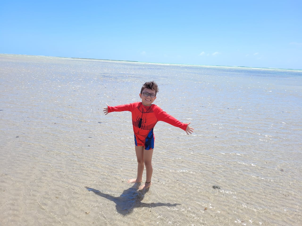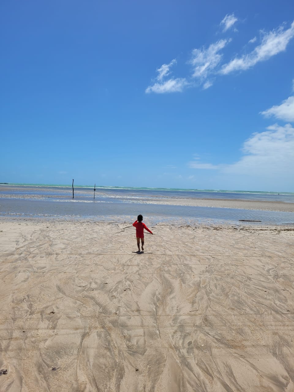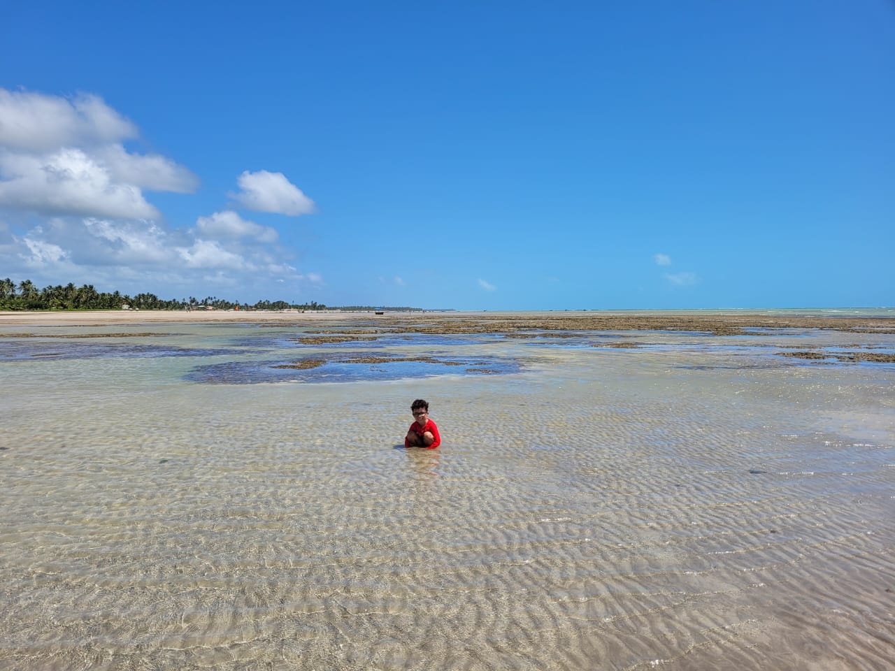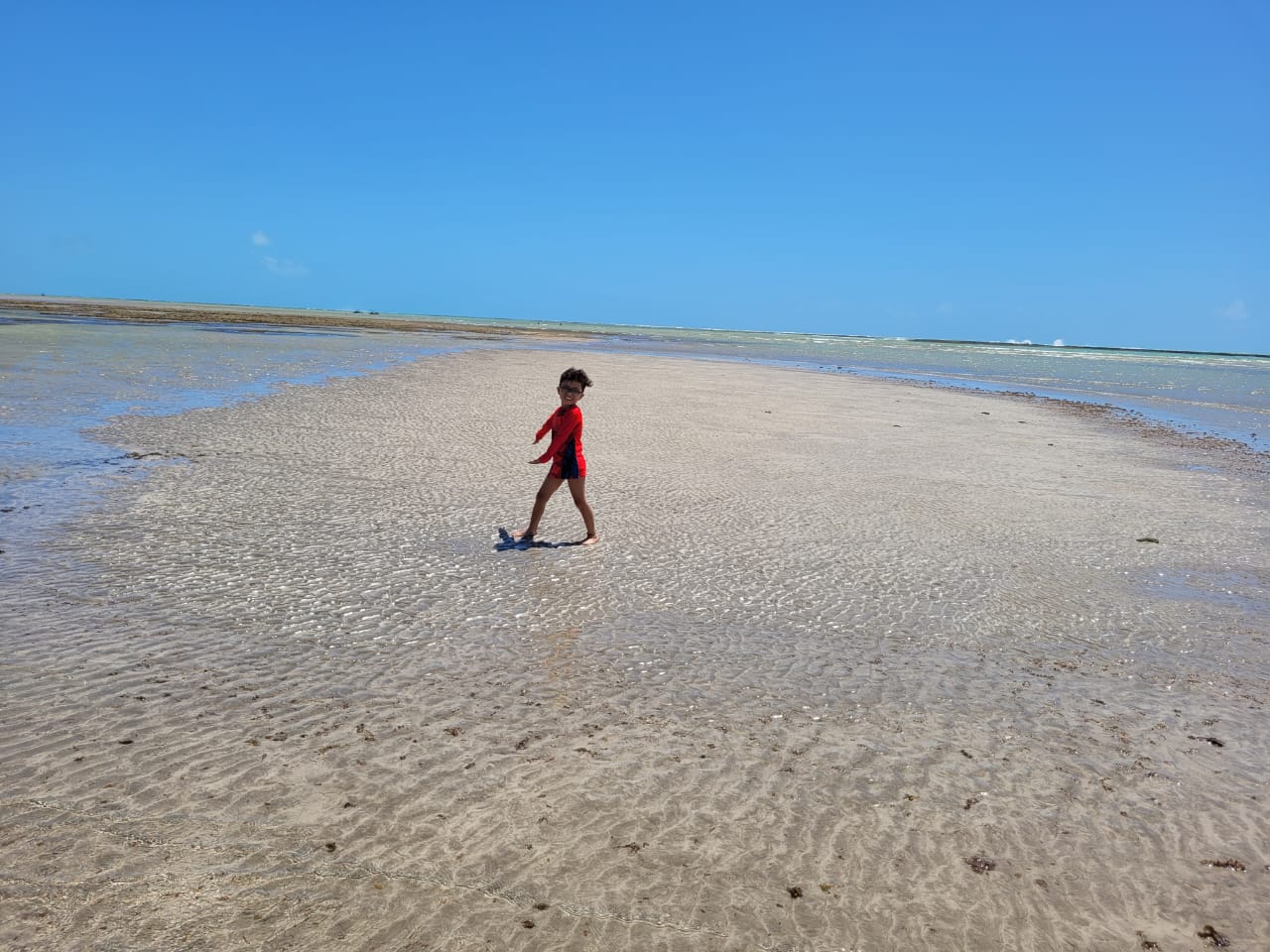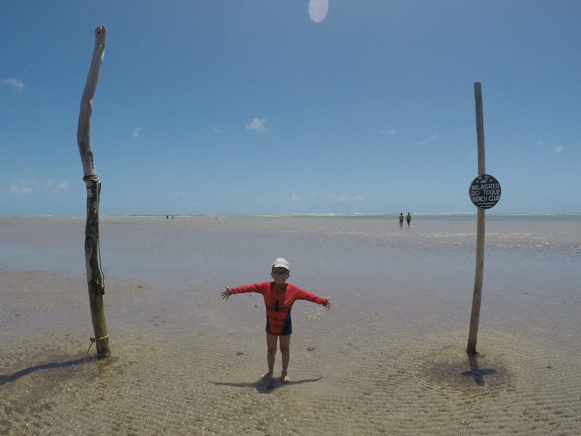Encontrei um banco de areia grande e estável, assim consegui ficar com o Arthur. De pé a água batia no meu joelho, assim fiquei sentado enquanto ele se divertia na água. O ponto de destaque aqui, é que estávamos a muitos metros de distancia da areia da praia!