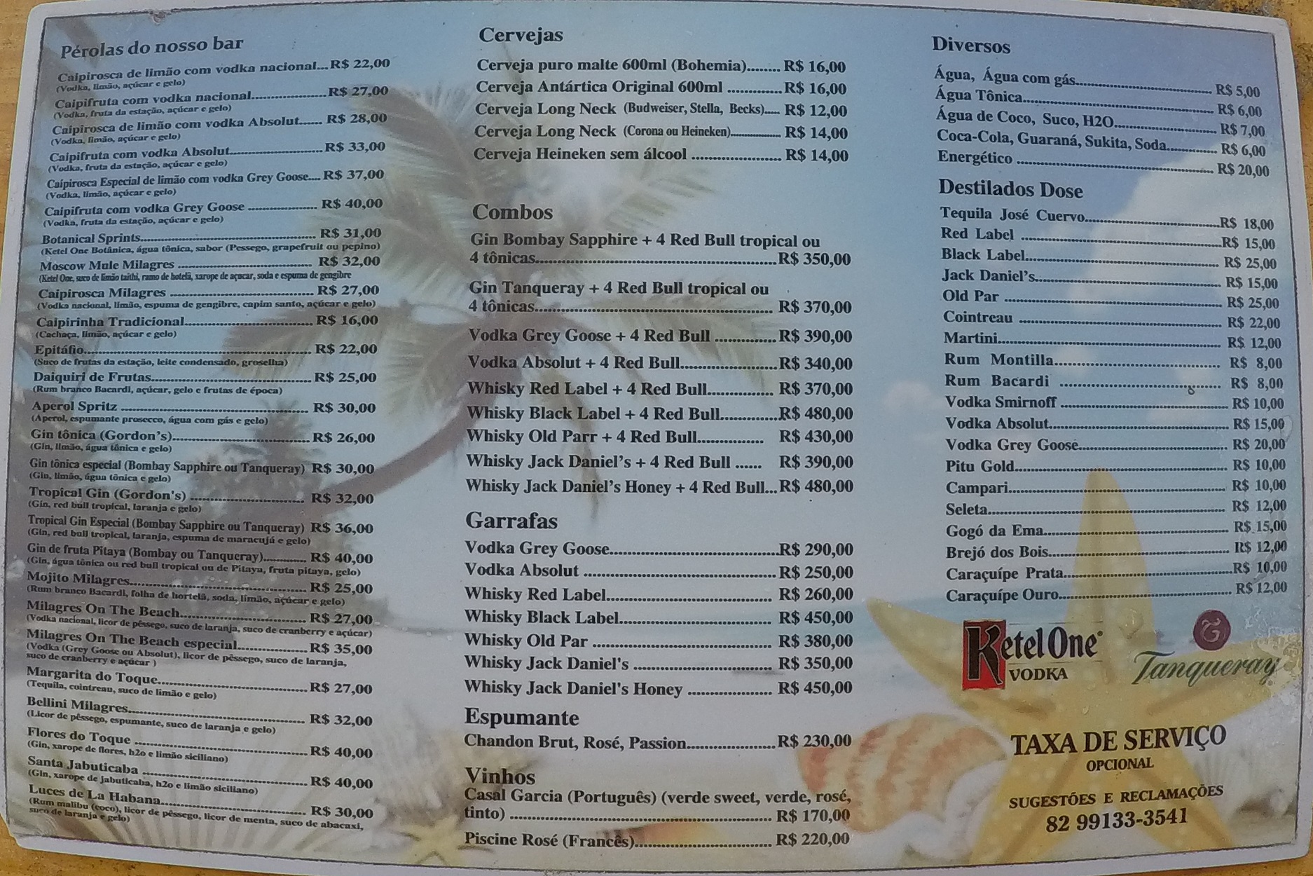 O cardápio assim como em todos os Beach Clubs tem uma boa variedade de comida, aperitivos, drinks e bebidas, com preços salgados. Nós pedimos no almoço a Picanha Argentina, que era um dos pratos mais caros e infelizmente nos decepcionamos. A carne estava cheia de nervo e nem de longe parecia um corte de primeiro. É complicado ir nos restaurantes pois nunca sabemos se a carne e/ou o peixe que citam no cardápio é de fato o que irão preparar e servir…