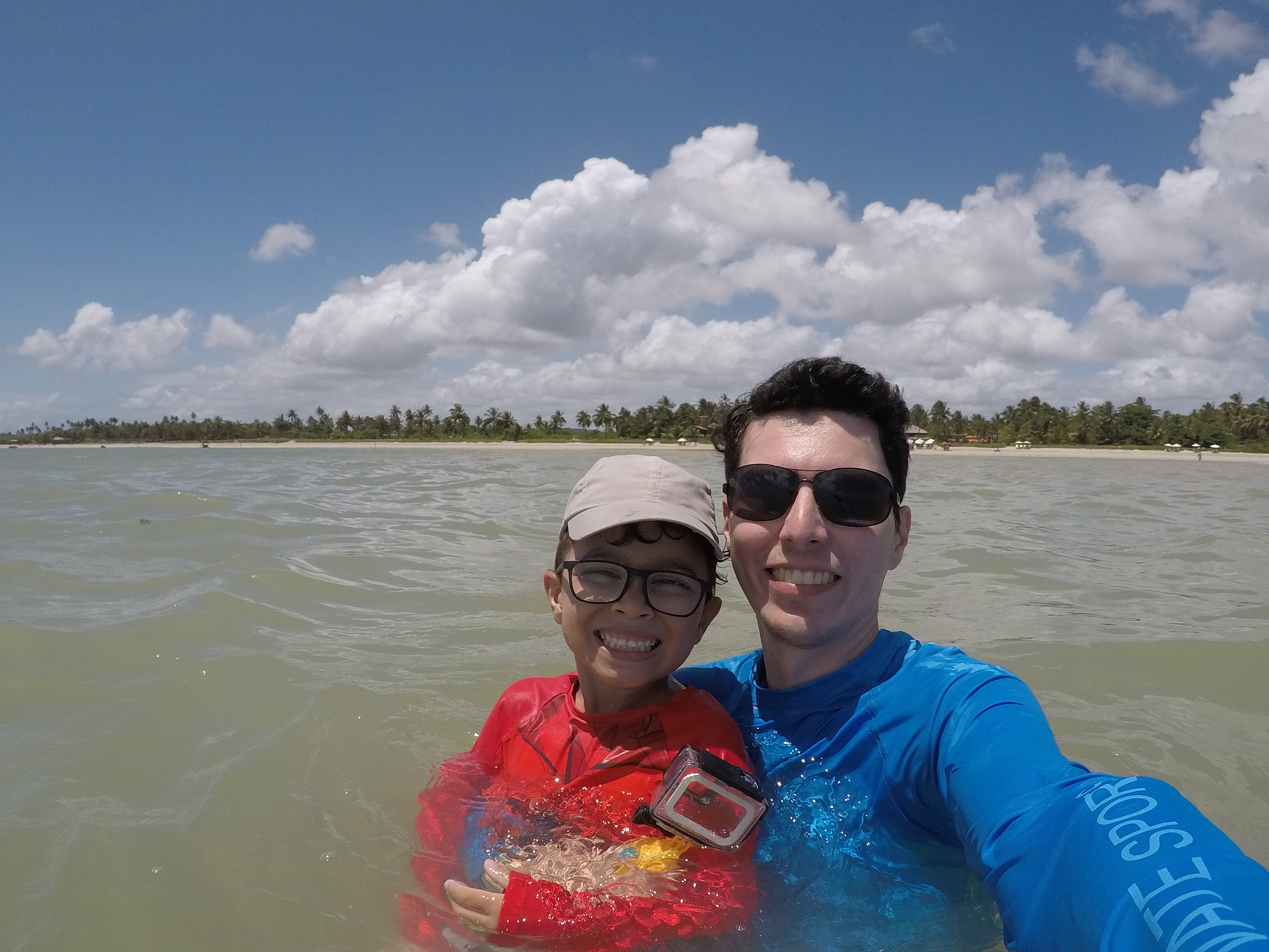 Encontrei um banco de areia grande e estável, assim consegui ficar com o Arthur. De pé a água batia no meu joelho, assim fiquei sentado enquanto ele se divertia na água. O ponto de destaque aqui, é que estávamos a muitos metros de distancia da areia da praia!