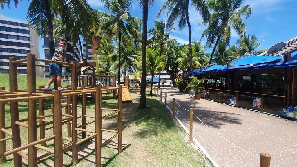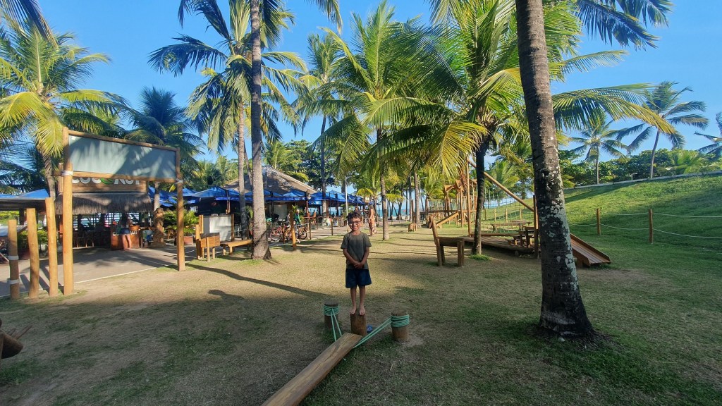 Logo em frente a nossa pousada, chegando na praia, havia o restaurante Coconuts. Este não é beira mar, ele fica no calçadão da praia. Há um parquinho no anexo do restaurante, com alguns brinquedos e o Arthur ficou por ali se divertindo um pouco!