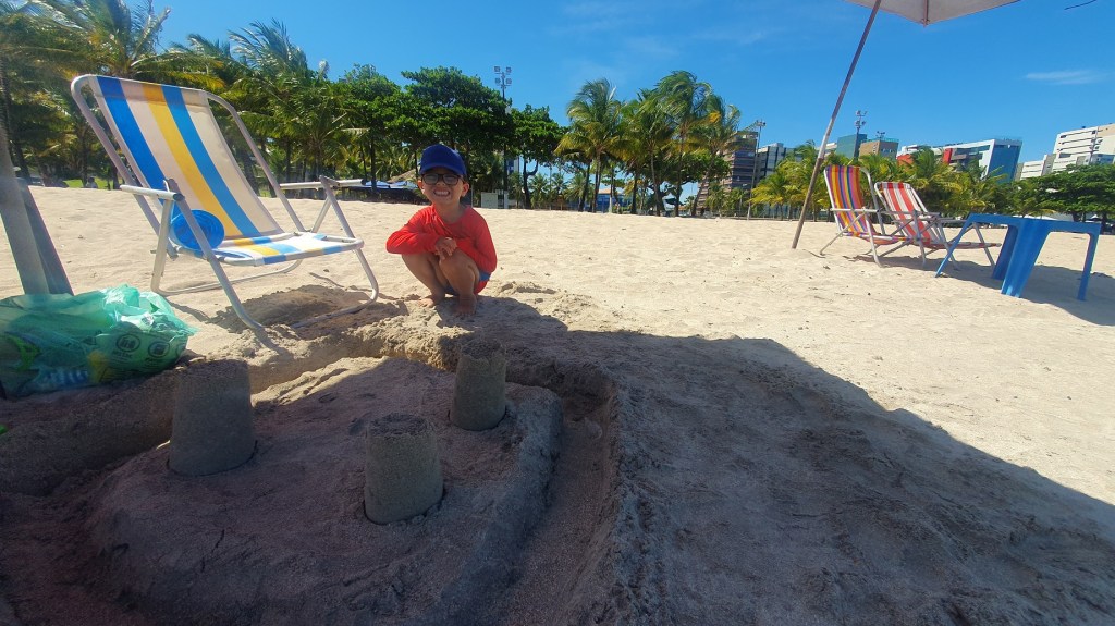Nos dirigimos para a praia e para a nossa surpresa, essa sim já é bem parecida com as praias que temos em São Paulo. A faixa de areia é imensa, mas pensa em algo largo mesmo, é impressionante a quantidade de faixa de areia que tem na Praia de Pajuçara. Logo que entramos na faixa de areia, vimos uma mãe e um filho com diversas cadeiras e guarda sol. Como não tem barraquinha dentro da praia, aqueles carrinhos de comida como em São Paulo, há essas pessoas que alugam os itens para que você possa levar os comes e bebes e assim passar o dia na praia. O aluguel de 3 cadeiras e 2 guarda sol saiu por R$ 35,00 o dia inteiro. Confesso que achei que seria mais de R$ 100,00. Quando chegamos tinha 2 cadeiras e 1 guarda sol, como estávamos em 4 e o Vitor precisaria dormir ao longo do dia, pedi uma cadeira espreguiçadeira e outro guarda sol, e literalmente foi R$ 5,00 por item. Senti que se eu pressionasse conseguiria ainda um desconto, mas de verdade o valor estava muito barato e não quis explorar a família. Topei e o filho dela prontamente organizou tudo para nós próximo da água para o Arthur poder brincar.