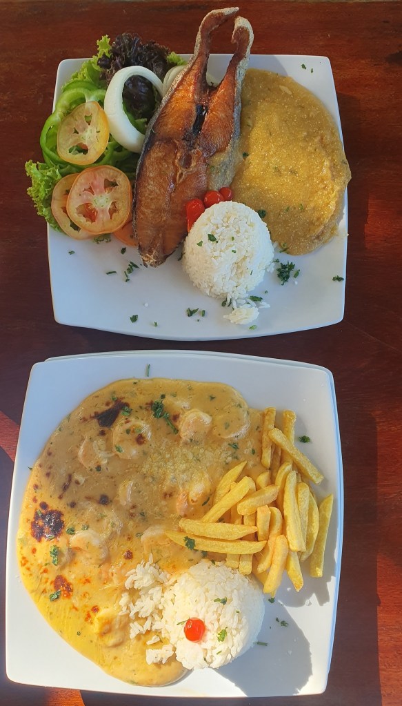 A Paty pediu pra ela e para o Arthur um prato de peixe frito e eu decidi experimentar o famoso prato Camarão com Chiclete! Ambos os pratos são espetaculares, e esse prato Camarão com Chiclete é uma delicia. Diversos restaurantes que passamos, tinha na frente uma placa, um banner, chamando a atenção para este prato. O chiclete é um queijo que eles fazem maravilhoso, parece com o gosto do 4 queijos que temos nas pizzas tradicionais, mas mega “grudento”. Não é um molho, ele gruda mesmo e eu creio que é dessa situação que chama de “chiclete”. O prato foi muito bem servido e quase não aguentei rss….