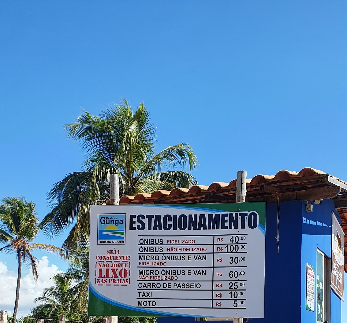 Já que pagamos para estacionar no local, para entrar no Gunga Beach Club, não há custo. É possível escolher este ou algum outro Beach Club no local sem a necessidade de pagar para entrar. Especificamente no Gunga Beach Club que ficamos, a única forma de pagar seria escolhendo ficar de frente para o mar, numa área que eles chamam de VIP pois possui 2 espreguiçadeira, 2 cadeiras, 2 mesas e um guarda sol. Para ficar neste local nós pagamos o valor de R$ 50,00 por adulto sem possibilidade de consumação.