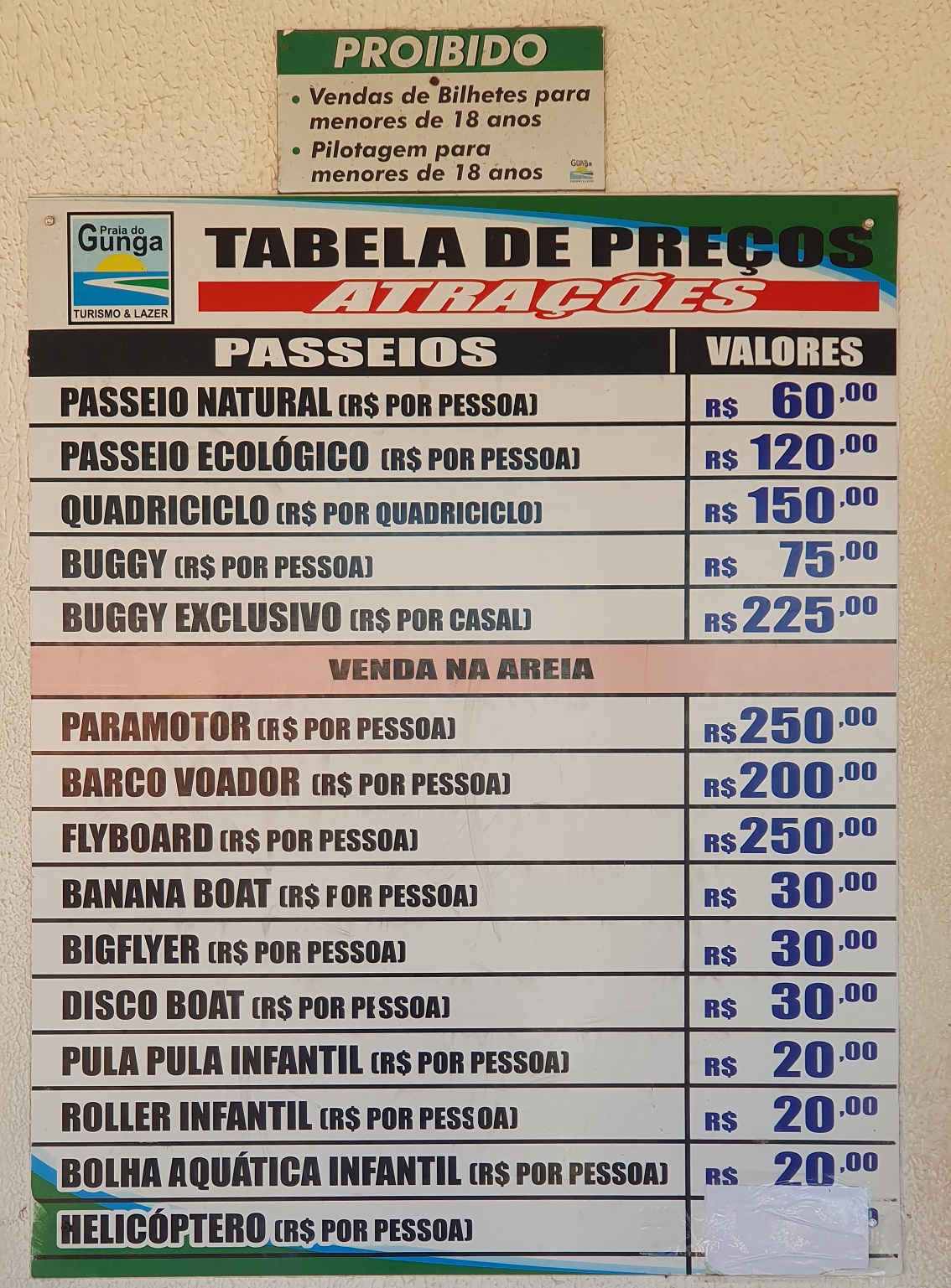 Saindo do Gunga Beach Club, fomos em direção a lojinha onde se faz a compra dos passeios. Importante citar que decidimos fazer no fim do dia para pegar o por do Sol, pois havia lido que era muito bonito a paisagem nas Falésias do Gunga.