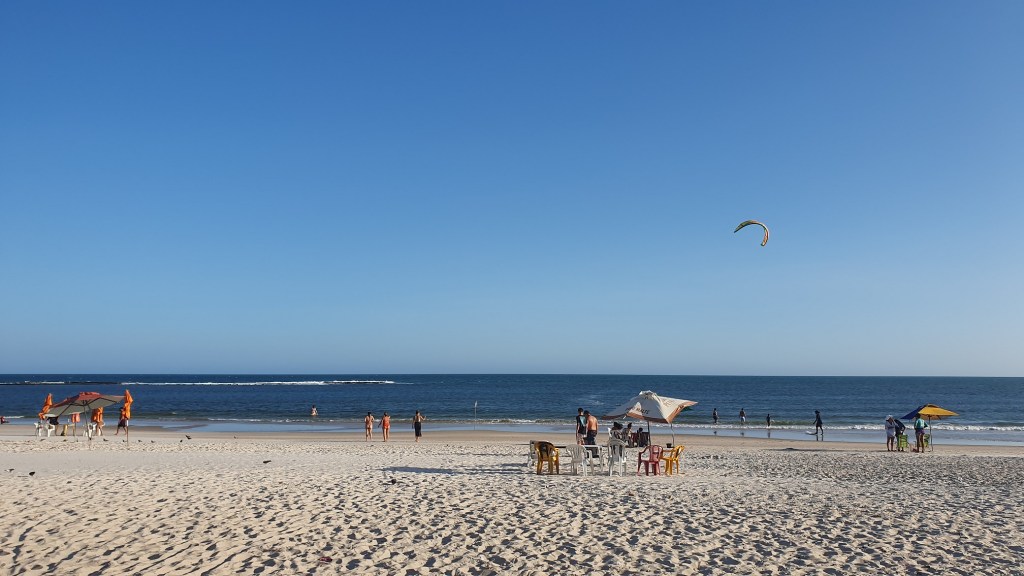 Diferente das demais praias que ficamos, esta possui uma estrutura bem próxima as praias de São Paulo, ou seja, há um número razoável de barracas na praia, que vendem comida e alugam as cadeiras e guarda sol. A faixa de areia é gigantesca, muito mas muito extensa mesmo, sendo parte areia fofa e a outra parte areia mais dura/molhada.