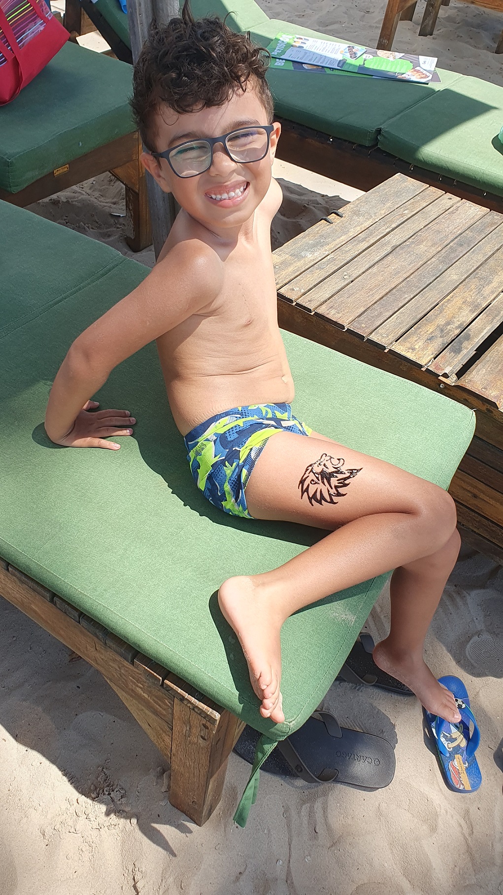 Nesta praia há diversos ambulantes que ficam andando, tanto com comida e bebida, quanto vendendo piercings, tatuagem de rena, roupas e acessórios e por ai vai. Essas pessoas vinham nos abordar, mas quem estava com comida não. Talvez seja algum acordo com a prefeitura, mas achei curioso. O Arthur quis fazer uma tatuagem de rena e a Paty comprou uma viseira para ela e um chapéu para o Vitor!
