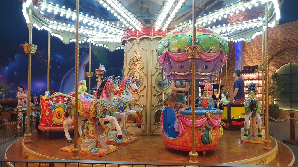 Ainda é possível tirar fotos em algumas áreas temáticas, jogar boliche, andar no carrossel e brincar em um brinquedão com escorregador.