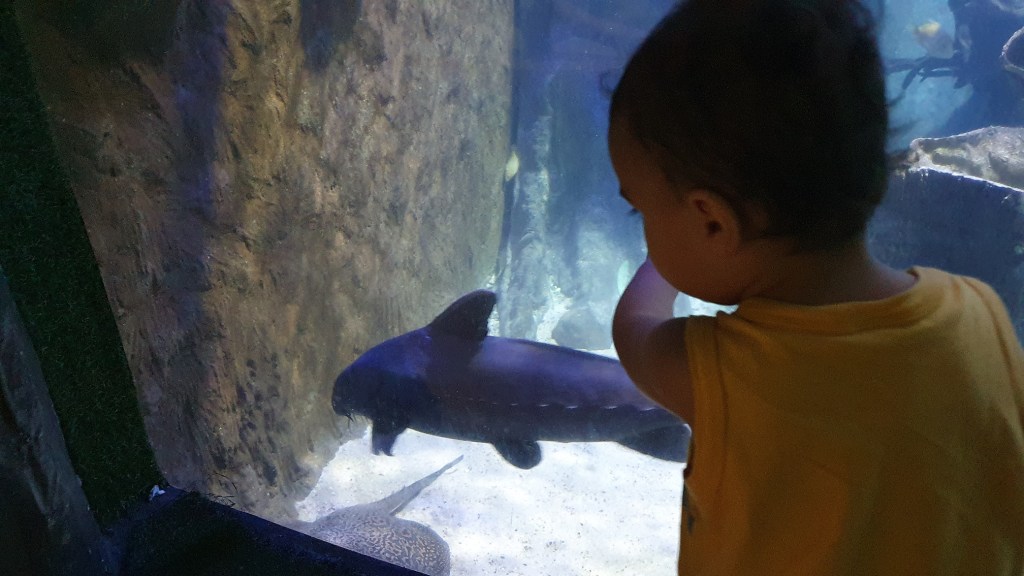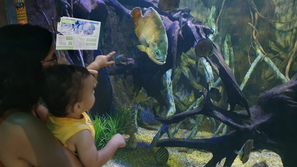Entramos, validamos os voucher e rapidamente acessamos os primeiros aquários. Na entrada o Vitor por ser menor e ser a primeira vez que via os peixes, ficou maravilhado, ficava correndo de um lado para o outro olhando os tanques, mas ainda com muito receio de colocar a mão no vidro, com medo de algum peixe “morder” rsss. Mas logo perdeu o medo e começou a interagir!
