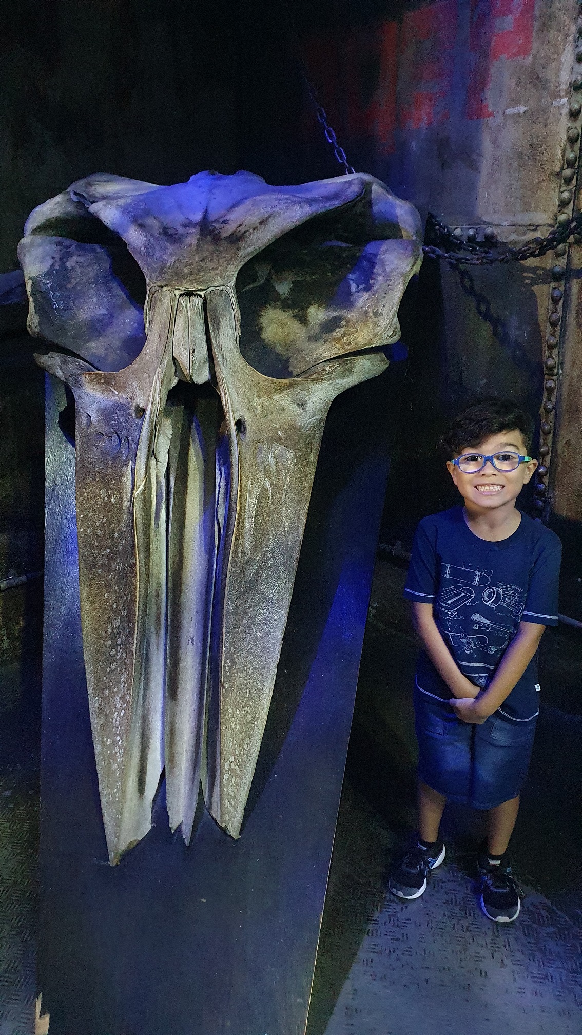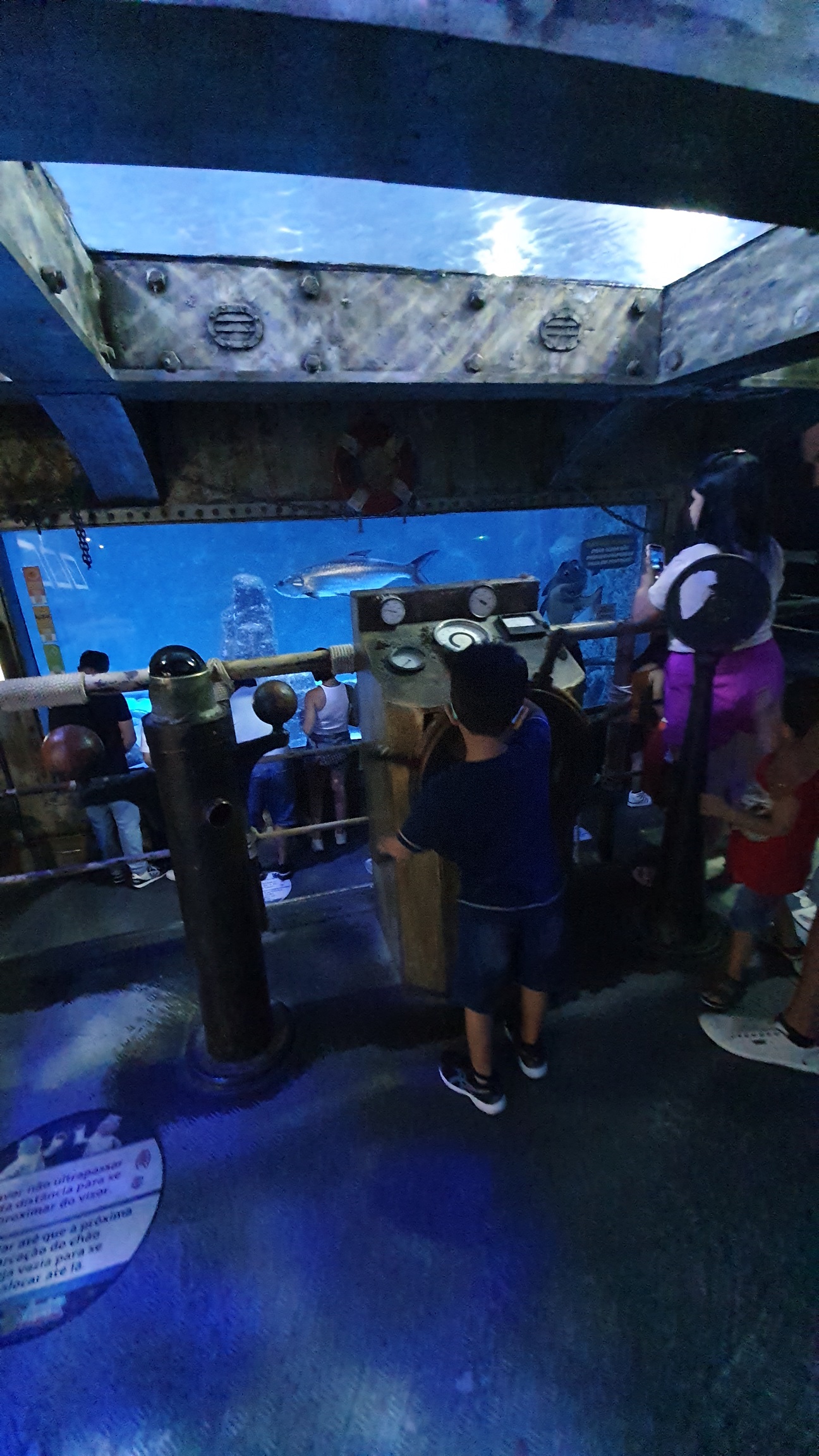 Neste mesmo túnel, tivemos acesso a um submarino “tombado” em que podíamos ver diversas estruturas e no fim dele, há um enorme tanque com diversos tubarões, raias e tartarugas. Esta parte foi SUPER LEGAL, pois podíamos ver os peixes passando por todos os lados e em cima de nossas cabeças! Vale destacar que essa parte é SUPER FRIA, não sei exatamente o motivo, mas tivemos que colocar blusa no Vitor e o Arthur ficou reclamando de frio, só que pra ele não havíamos levado blusa.