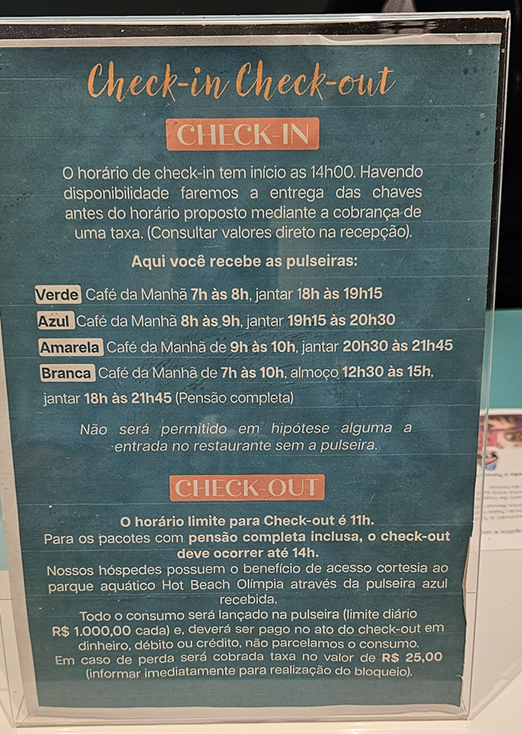 Achei legal também que agora está melhor dividido os horários do jantar. Antes já tinha essa divisão, mas lembro de ter visto pessoas de outros horários entrando e então por vezes ficava cheio. Agora havia uma pulseira, identificando o seu horário.