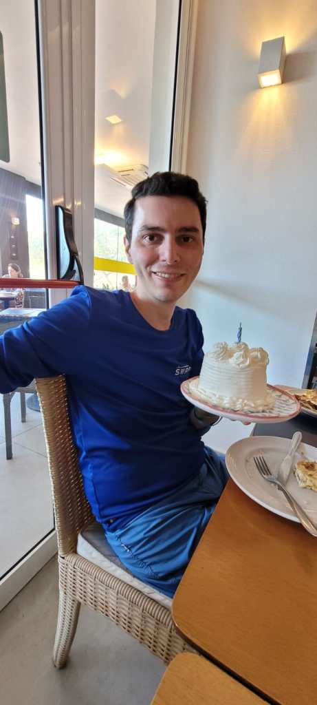 De quebra ainda foi possível comemorar meu aniversário de 37 anos no resort! A Paty preparou uma surpresa e eu nem estava esperando, haha. Do nada, estava eu dando café da manhã para o Vitor quando chega um monte de pessoas do hotel com um bolo na mão, cantando parabéns! No começo fiquei constrangido mas depois entrei na onda!