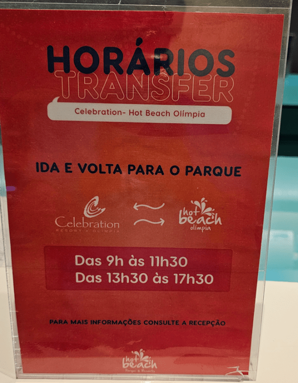 O translado do resort até o parque, leva cerca de 10 minutos, mas é super prático porque não precisa ficar usando carro. Os Hot Beach Resort e o Hot Beach Suites, ficam grudados no parque, é só descer e entrar no parque, mas achei que o valor a mais que se pagava, cerca de R$ 2.5k e R$ 1.5k respectivamente, não valiam apenas, por conta de um deslocamento de 10 min.