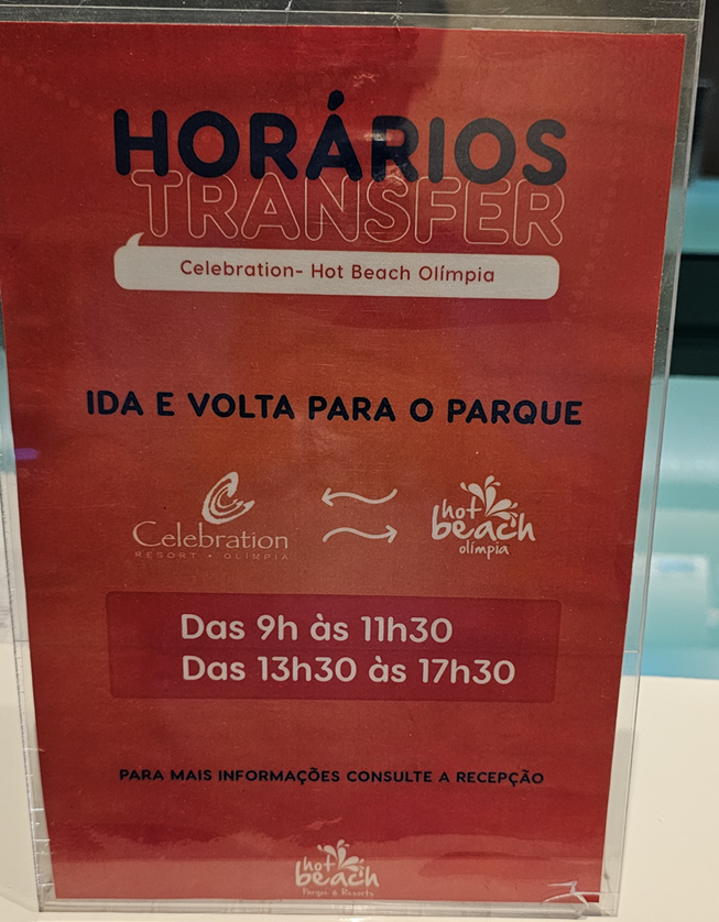O que achei de diferente e melhorado da primeira visita para agora, foi o translado e os horários. Agora não é mais aleatório, mas programado para sair de 30 em 30 minutos, tanto do resort quanto do parque. Da outra vez era uma mini van e demorava para caber todos, agora é um ônibus e fica muito mais garantido conseguir entrar.