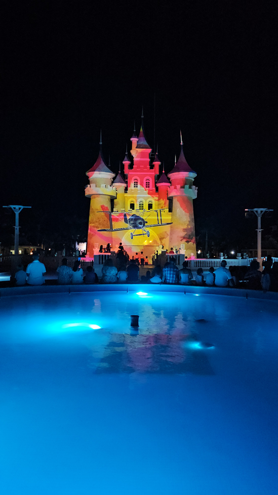 A piscina principal do Fantasia é ENORME e foi, sem dúvida, a grande estrela pra nós: além de ampla, tem atrações aquáticas, áreas para crianças, espaços para descansar e, à noite, shows de luzes e entretenimento infantil que deixam os pequenos vidrados. Em algumas acomodações (como a Castle Front), dá até pra assistir ao show direto da varanda.
